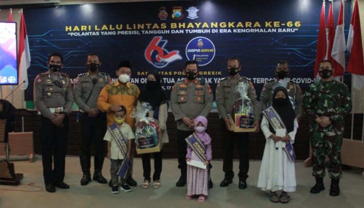 GRESIK,IKAGAWANEWS.ID – Dalam memperingati Hari Lalu Lintas Bhayangkara ke-66, sebanyak 63 anggota polantas Polres Gresik mengabdikan diri sebagai orang tua asuh bagi 63 anak yatim yang orang tuanya meninggal dunia karena covid-19.