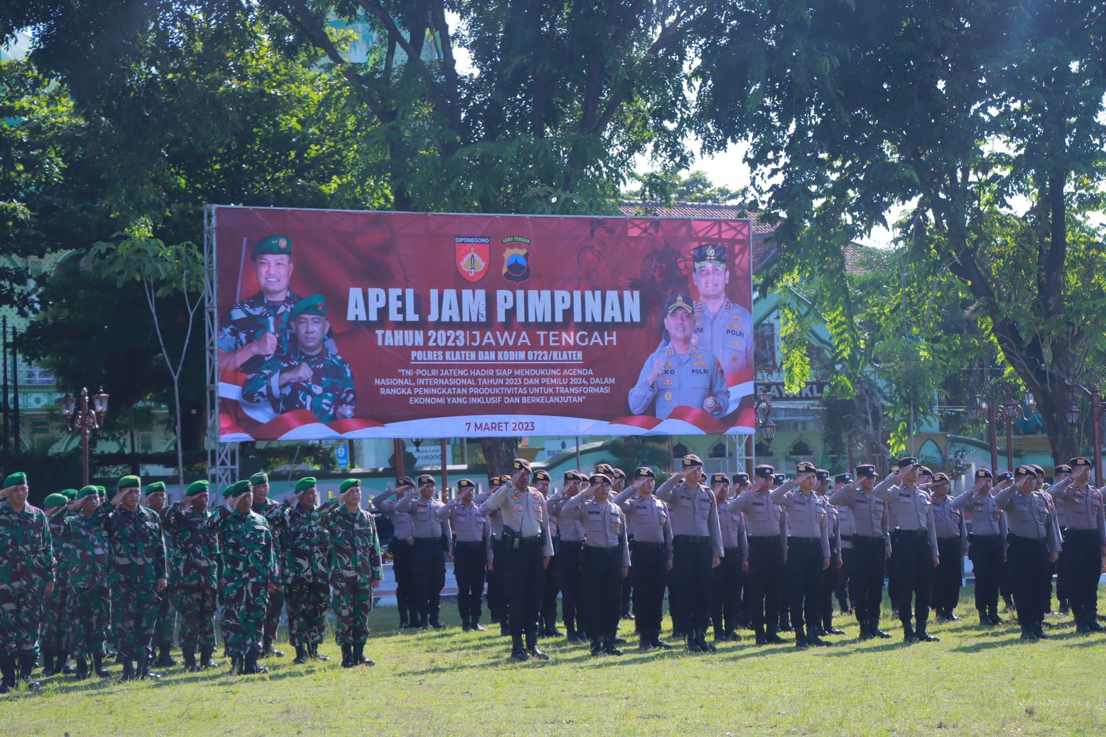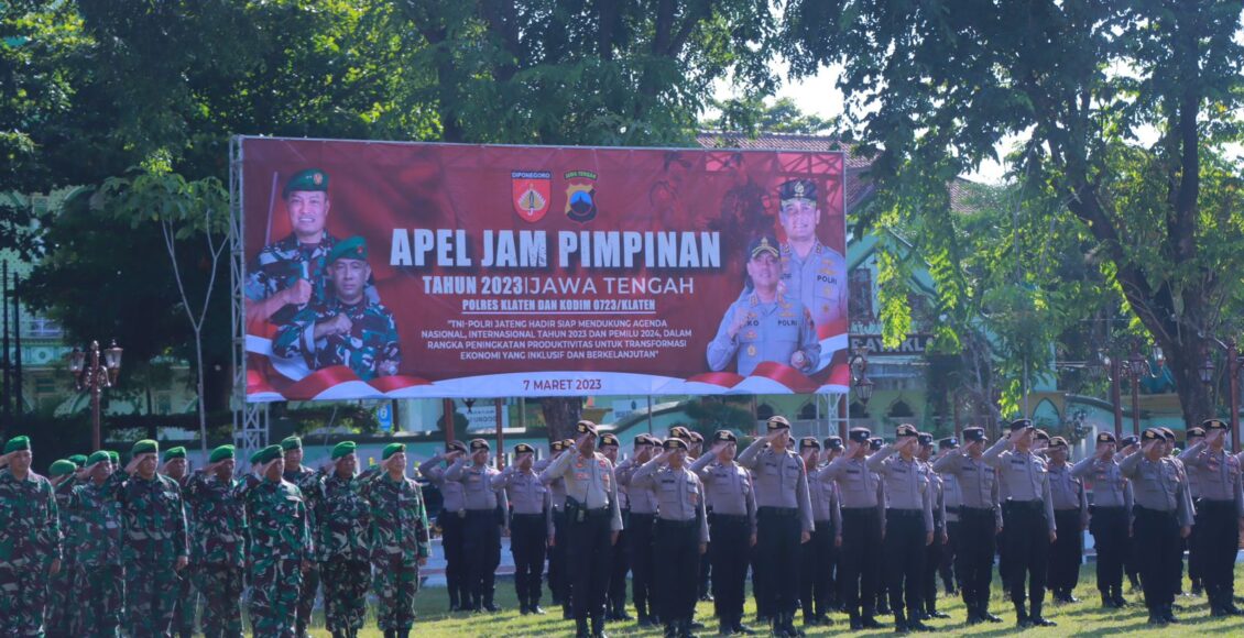 Apel dengan tema “TNI-Polri Jateng Hadir Siap Mendukung Agenda Nasional, Internasional Tahun 2023 Dan Pemilu 2024, Dalam Rangka Peningkatan Produktivitas Untuk Transformasi Ekonomi Yang Inklusif Dan Berkelanjutan” ini dipimpin bersama oleh Komandan Kodim 0723/Klaten Letkol Czi. Bambang Setyo Triwibowo, SE. M.Han. dan Kapolres Klaten AKBP Eko Prasetyo SH SIK MH. Adapun peserta terdiri dari anggota dan perwira dari kedua instansi tersebut.