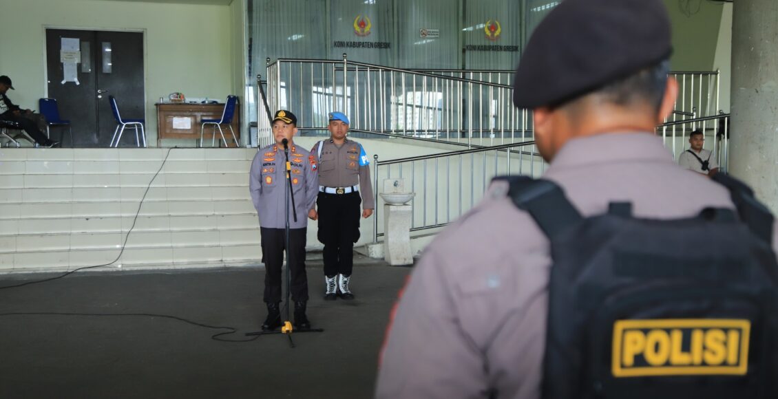 Dalam apel Pengamanan pertandingan Sepak bola BRI Liga 1 antara Persebaya Surabaya VS PSM Makasar yang dipimpin Kapolres Gresik AKBP Adhiya Panji Anom