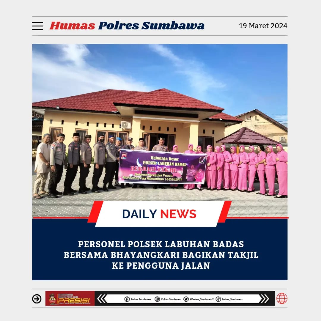 SUMBAWA,ikagawanews.id – Dalam rangka menjalin kedekatan dengan masyarakat, jajaran personil Polsek Labuhan Badas Polres Sumbawa bersama Bhayangkari membagikan takjil kepada para pengguna jalan bertempat di jalan garuda depan masjid Nurul Maqbullah Desa Labuhan Sumbawa dan Mako Polsek Labuan Badas, Senin (18/03/24) sore.Kapolres Sumbawa AKBP Heru Muslimin S.I.K, M.I.P, melalui Kapolsek Labuhan Badas IPDA Rohmad Rondi mengatakan, kegiatan ini sengaja dilakukan oleh jajarannya sebagai upaya Polri dalam rangka meningkatkan rasa kepedulian Polri kepada masyarakat, khususnya umat Muslim yang sedang menjalankan ibadah puasa Ramadhan 1445 H.