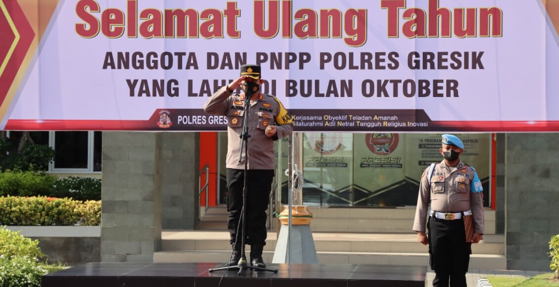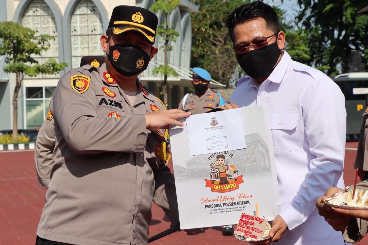 “Selamat ulang tahun Gresik semoga diberikan umur panjang, bermanfaat kedepannya, kesehatan mudah-mudahan kita semua diberikan keselamatan dunia dan akhirat,” ucap AKBP Mochamad Nur Azis membuka apel.