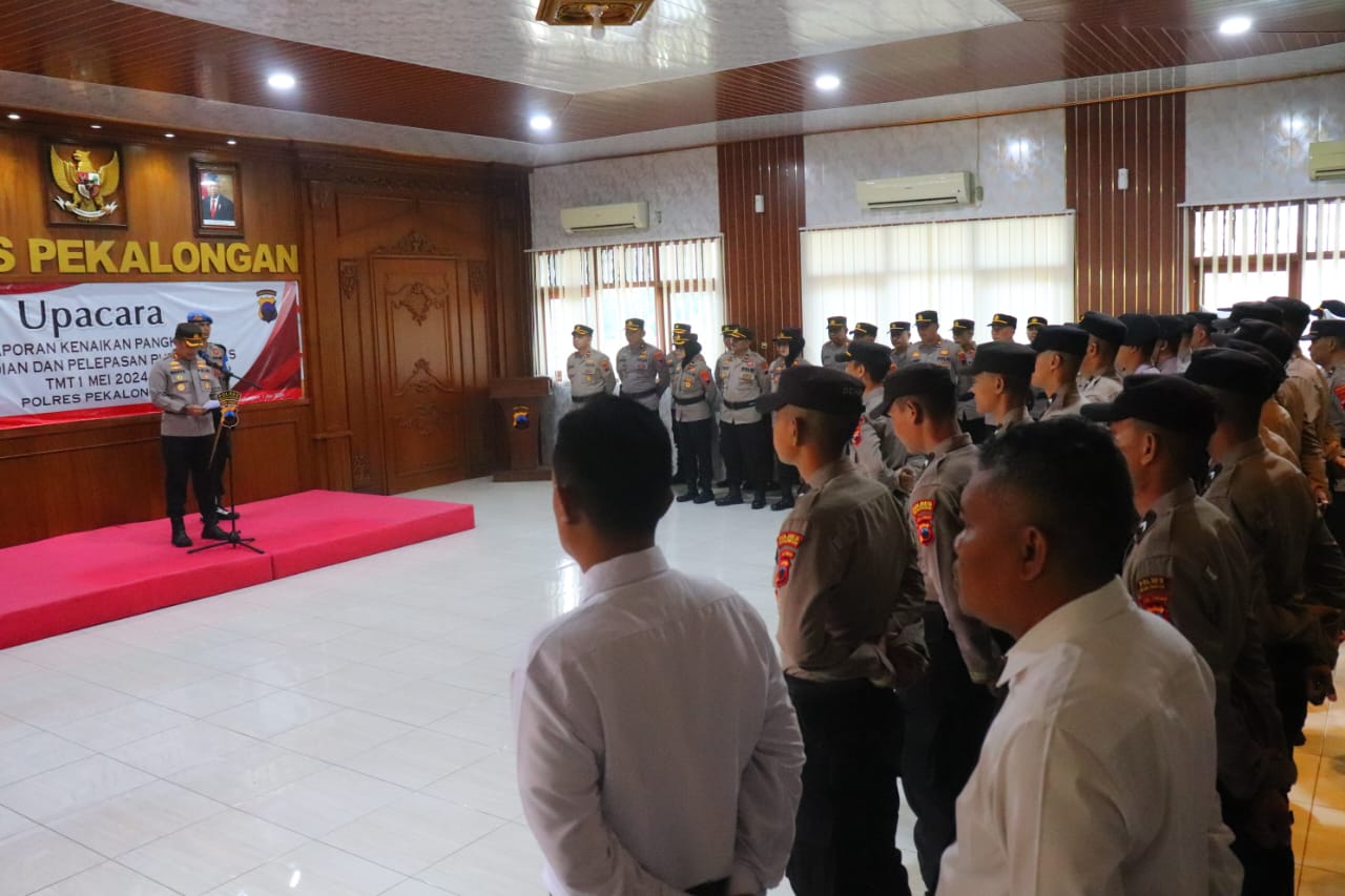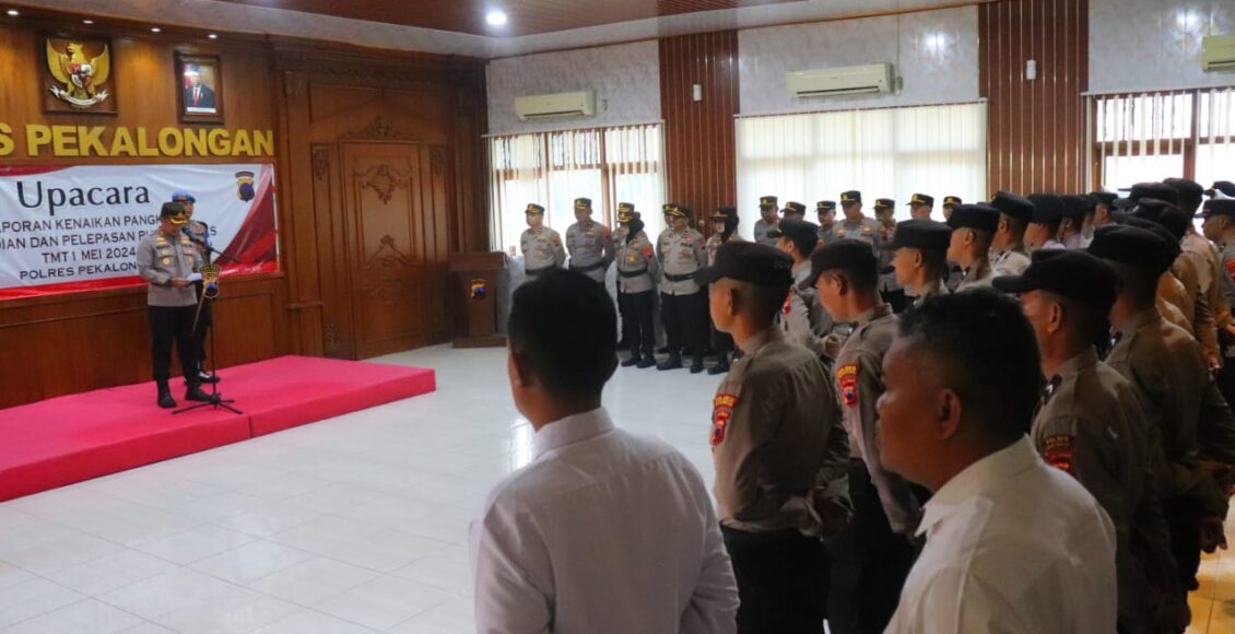 PEKALONGAN,ikagawanews.id – Bertempat di aula Polres Pekalongan, telah dilaksanakan upacara kenaikan pangkat pengabdian, Rabu (01/05). Upacara yang dipimpin oleh Kapolres Pekalongan AKBP Wahyu Rohadi, S.I.K., M.H dihadiri Wakapolres Pekalongan bersama PJU, para Kasat, Kapolsek jajaran, para Perwira, Ketua Bhayangkari Cabang Pekalongan beserta pengurus serta anggota Polres Pekalongan.