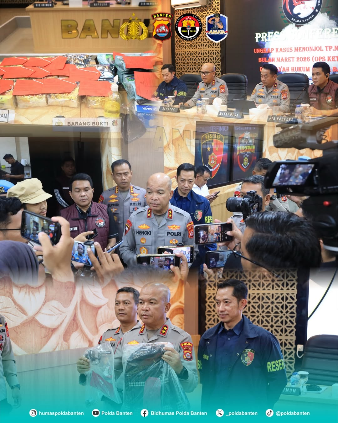 BANTEN,ikagawanews.id – Polda Banten menggelar press conference terkait pengungkapan kasus tindak pidana penyalahgunaan narkotika jenis sabu serta kepemilikan senjata ilegal yang dilaksanakan di Aula Ditreskrimum Polda Banten, Kamis (26/03). Kegiatan ini dipimpin langsung oleh Kapolda Banten Irjen Pol. Hengki, S.I.K., M.H.
