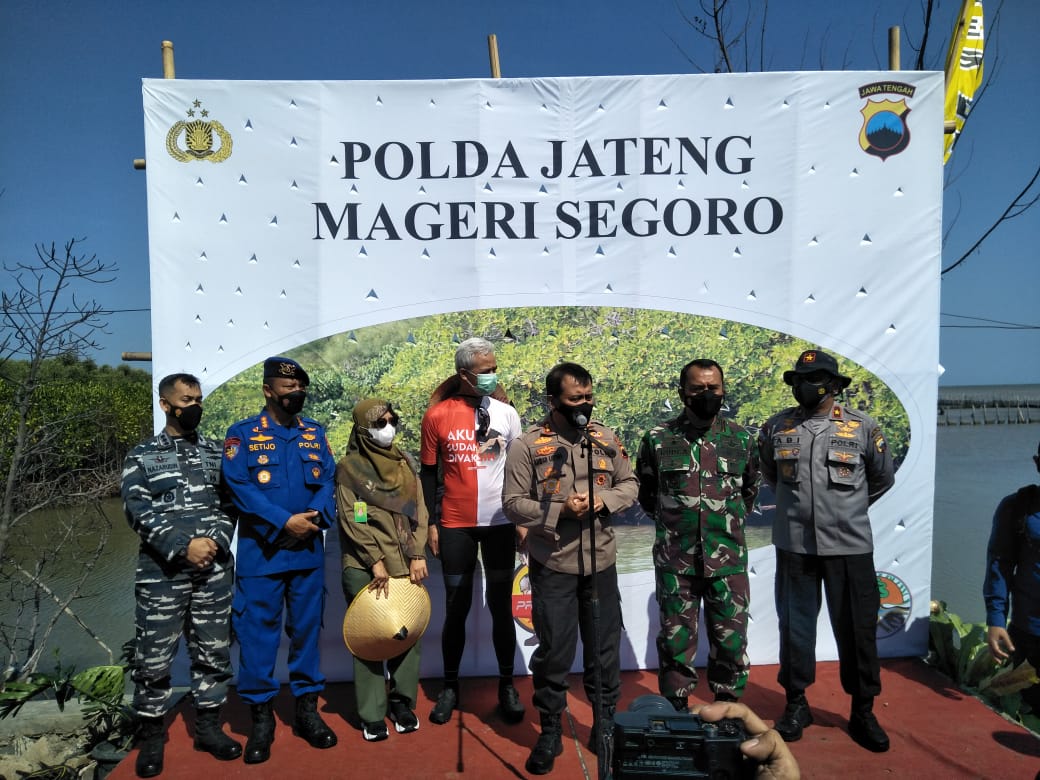 “Program penanaman mangrove dipusatkan di Desa Bedono, Kecamatan Sayung, Kabupaten Demak tersebut di ikuti oleh 16 Polres yang memiliki wilayah pantai secara bersama-sama kita louncing hari ini”,kata Kapolda Jateng.