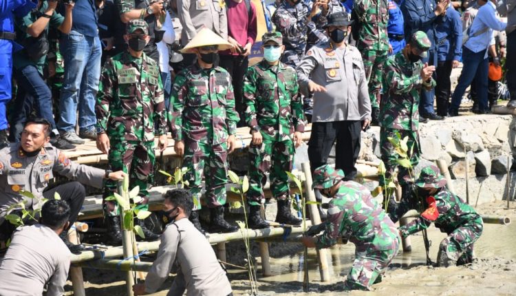 Demak , ikagawanews.id – Kepolisian Daerah Jawa Tengah (Polda Jateng) menggelar program “Mageri Segoro”, artinya membuat pagar hidup untuk daerah-daerah yang banyak muara, sungai dan pantai dengan melakukan kegiatan penanaman mangrove, bertempat di Desa Bedono, Kecamatan Sayung, Kabupaten Demak. Selasa (12/10/2021).
