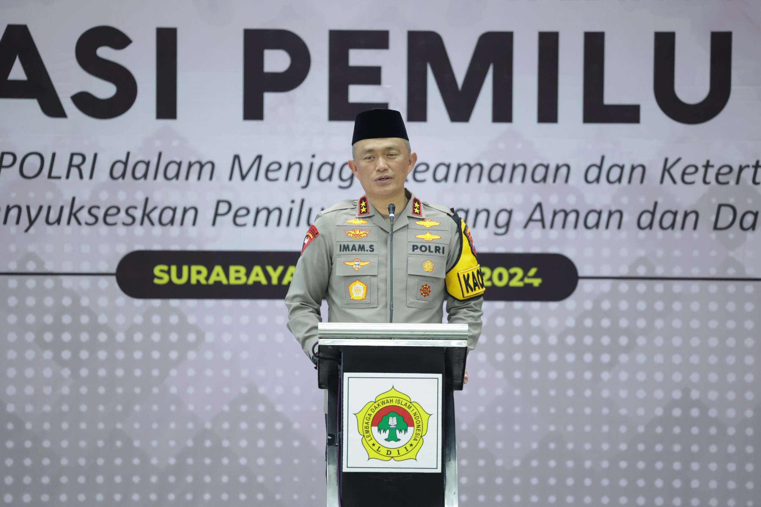 Kepala Kepolisian Daerah Jawa Timur Irjen Pol Drs.Imam Sugianto,M.Si pada acara Deklarasi Pemilu Damai yang diinisiasi DPW LDII Jatim dan DPD LDII Kabupaten/Kota, menyampaikan apresiasi kepada DPD LDII yang telah berkomitmen menjaga kondusifitas di Jawa Timur.