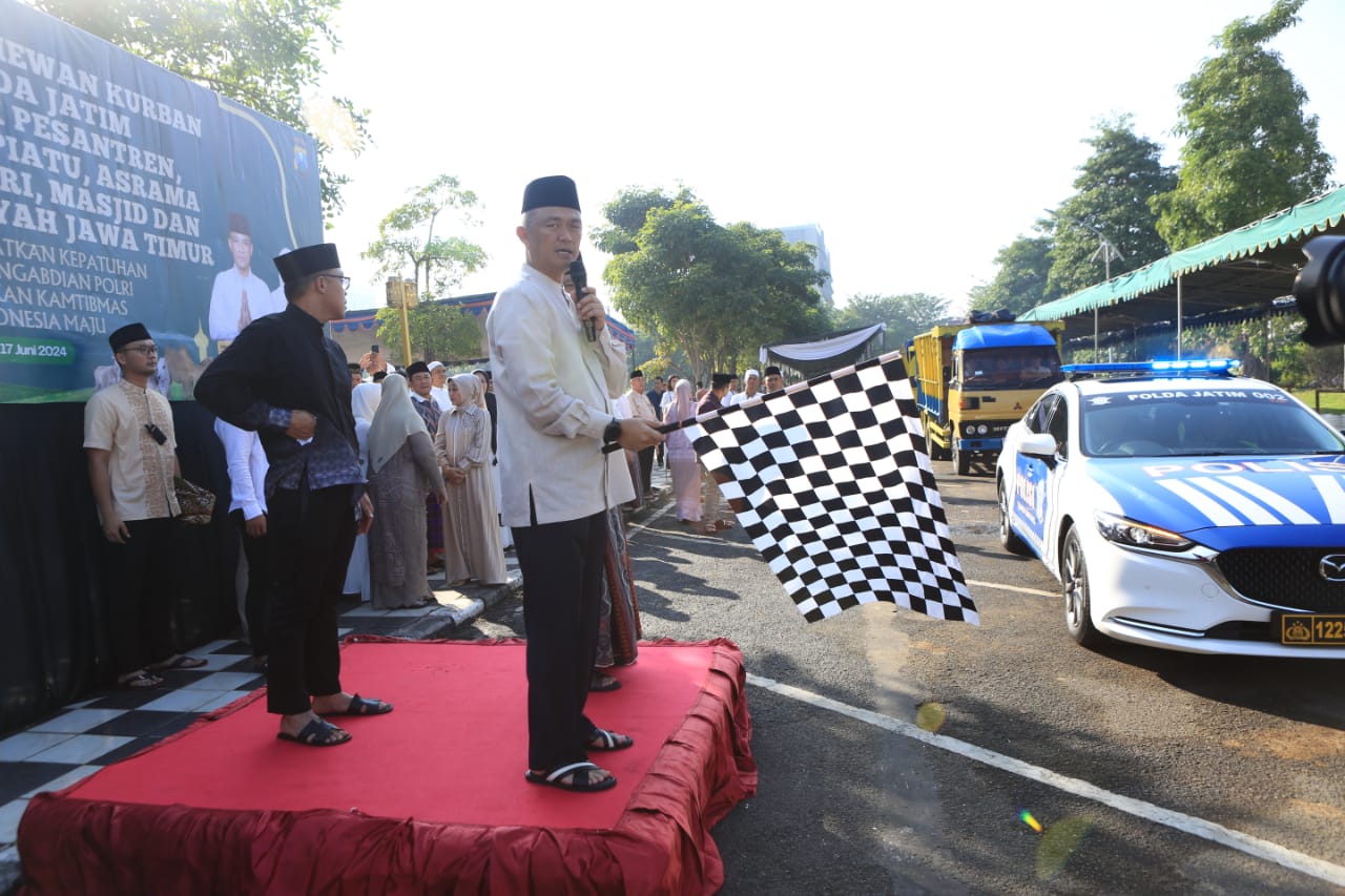 Usai mengikuti sholat ied, Kapolda Jatim bersama Wakapolda Jatim dan PJU Polda Jatim, secara simbolis melepas pendistribusian hewan kurban untuk diberbagai ke pondok pesantren, yayasan yatim piatu, asrama Polri, mitra Polri, masjid dan mushola di wilayah hukum Polda Jatim.