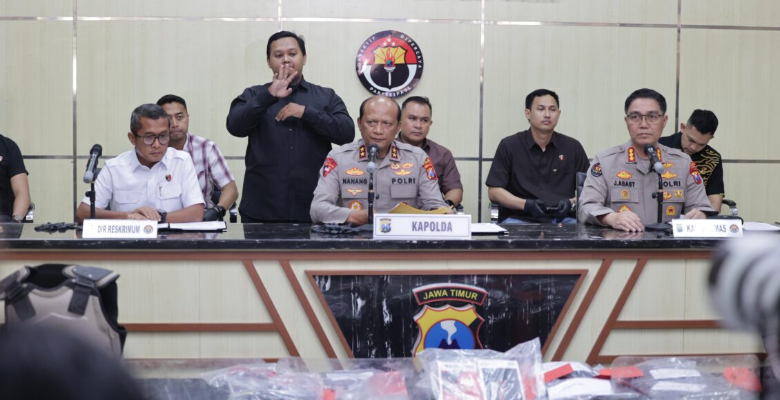 Kapolda Jatim Irjen Pol Drs. Nanang Avianto, M.Si., didampingi Kabid Humas Polda Jatim, Kombes Pol Jules Abraham Abast dan Dirreskrimum Kombes Pol Widi Atmoko, menyampaikan hasil penanganan hukum terkait aksi yang terjadi di wilayah hukum Polda Jawa Timur tersebut.
