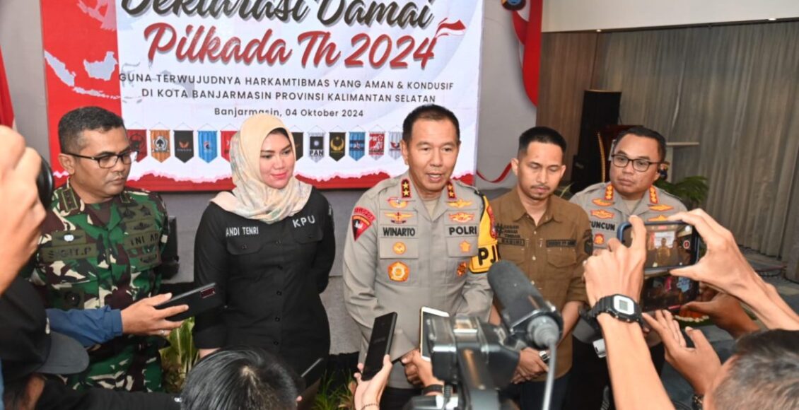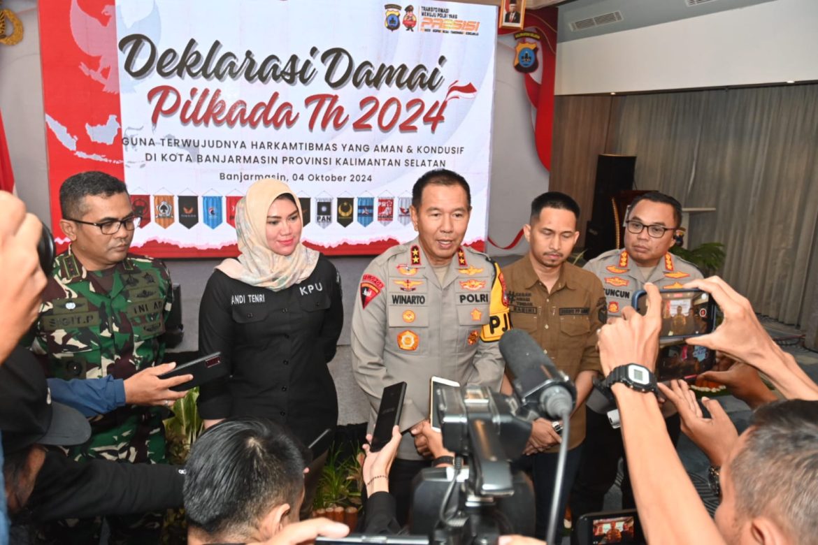 Kabid Humas Kombes Pol Adam Erwindi, S.I.K., M.H., mengatakan, dalam keterangannya Kapolda Kalsel Irjen Pol Winarto, S.H., M.H. menuturkan bahwa Deklarasi Damai ini digelar untuk mengajak seluruh unsur penyelenggara Pilkada 2024 beserta para pasangan calon Walikota dan Wakil Walikota untuk berkomitmen bersama agar tahapan-tahapan Pilkada di Kota Banjarmasin dapat berjalan aman, lancar dan kondusif.