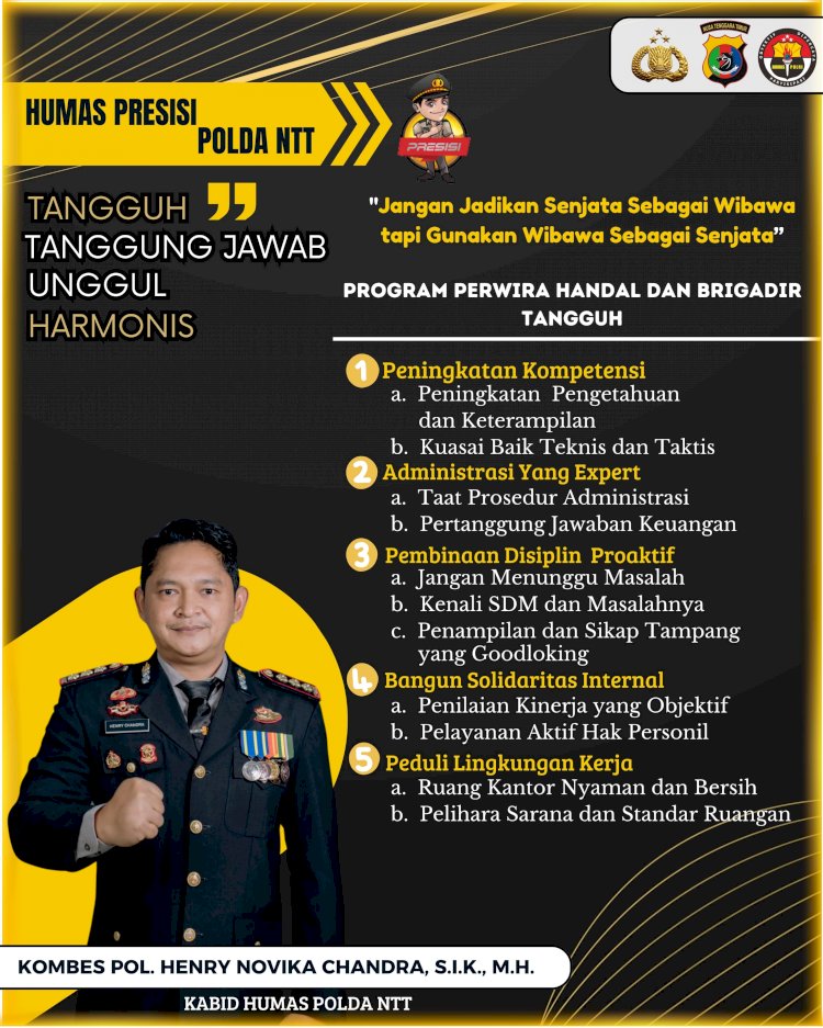 NTT,ikagawanews.id – Dalam menghadapi era digital dan tantangan komunikasi publik yang semakin kompleks, Bidang Humas Polda Nusa Tenggara Timur (NTT) di bawah kepemimpinan Kombes Pol. Henry Novika Chandra, S.I.K., M.H. terus mendorong peningkatan kualitas personel di bidang kehumasan. Melalui program “Perwira Handal dan Brigadir Tangguh”, Polda NTT berkomitmen menciptakan personel Humas yang kompeten, bertanggung jawab, dan mampu menjalin komunikasi efektif dengan masyarakat.
