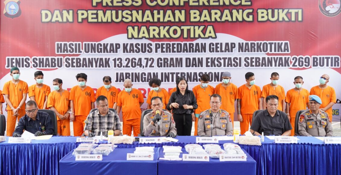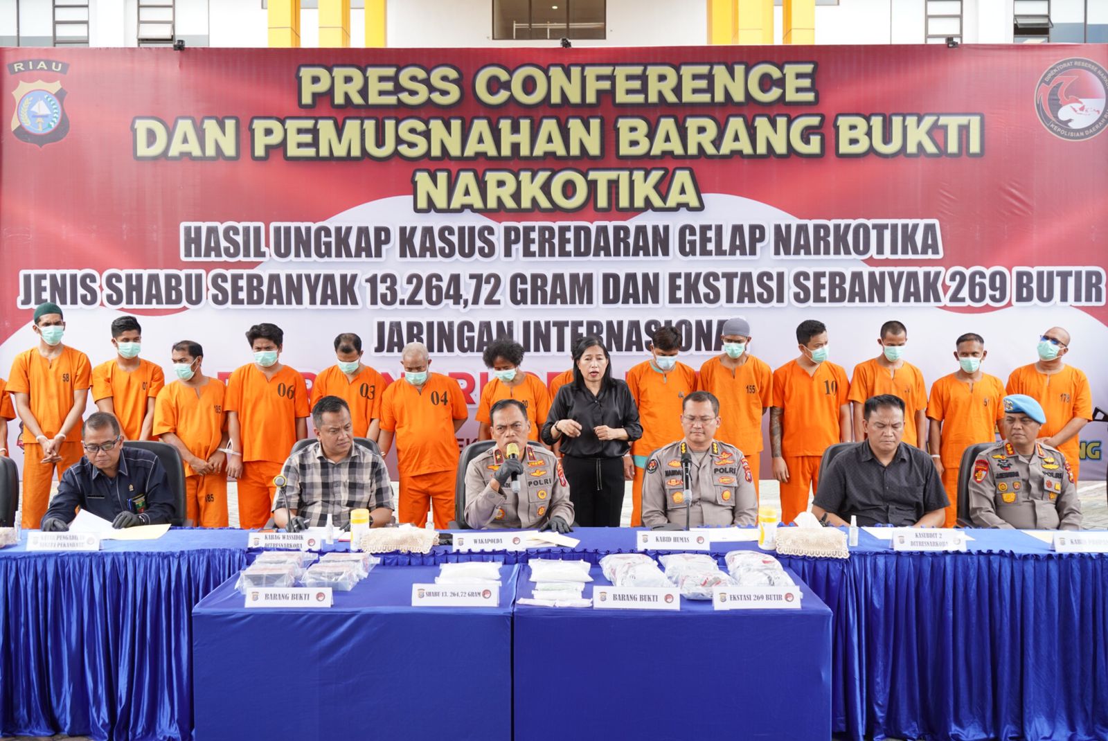 Pekanbaru,ikagawanews.id – Ditresnarkoba Polda Riau, Selasa (23/05/2023) siang, sekitar pukul 11.30 Wib, memusnahkan barang bukti narkotika jenis sabu seberat 13 Kg serta 269 butir pil ektasi yang disita dari tangan 15 orang tersangka kurir narkoba jaringan Internasional. Dimana satu diantaranya merupakan oknum petugas lapa kelas II B Narkoba, Rumbai.