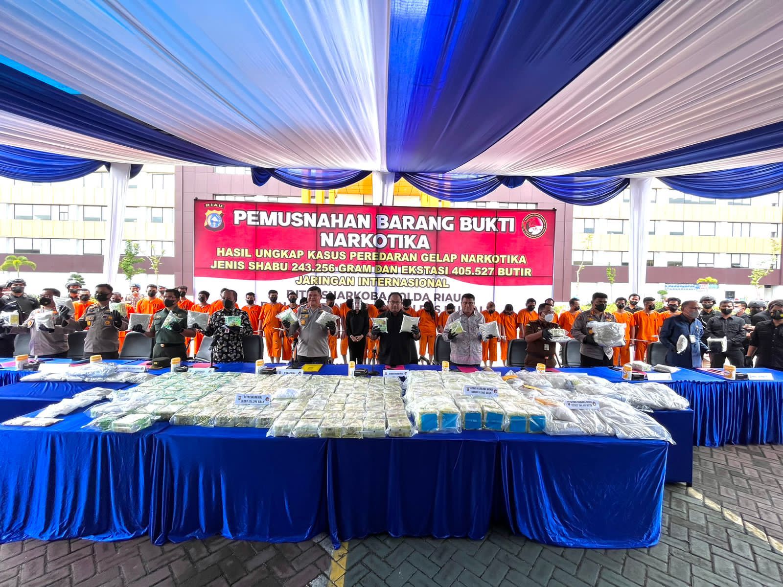 Barang bukti sebanyak 243 kg sabu dan 405.527 butir ekstasi yang dimusnahkan kali ini berasal dari 8 kasus yang ditangani Direktorat narkoba Polda dan Satuan narkoba Polres Dumai.