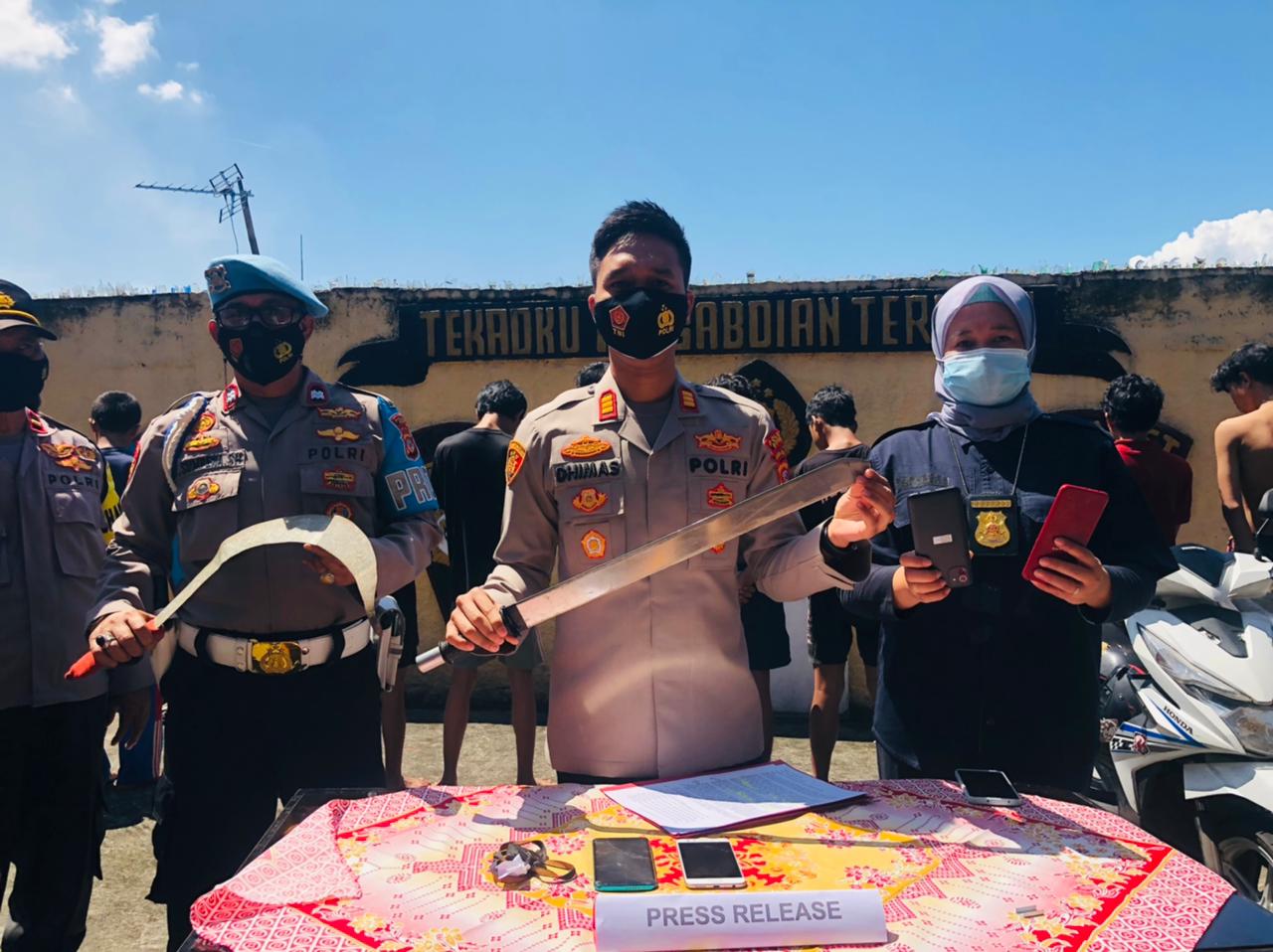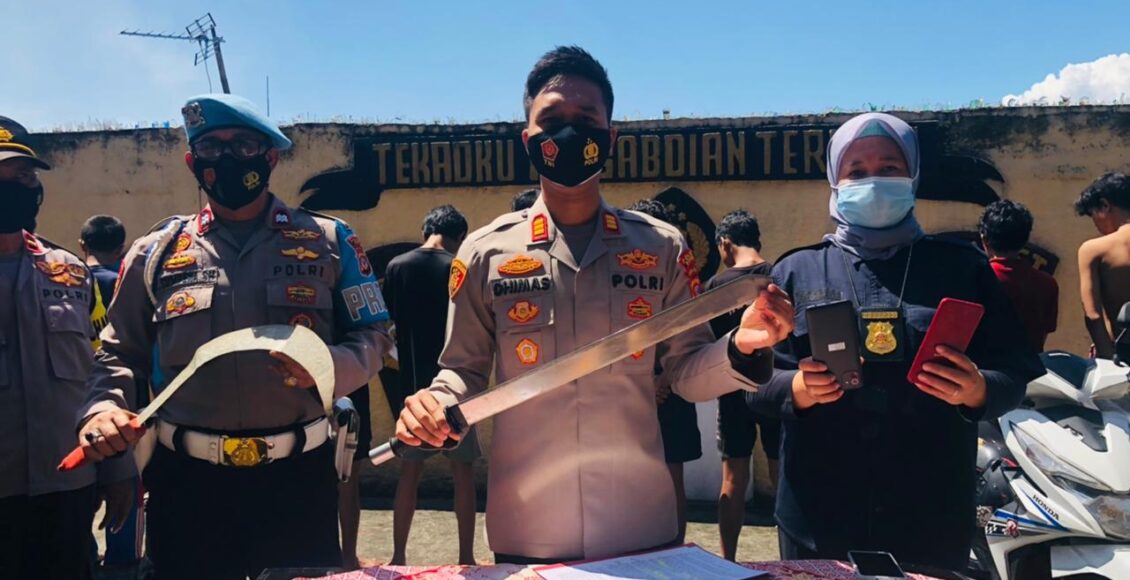 “Barang bukti pun ikut diamankan berupa pedang samudai dan celurit rakitan serta beberapa motor dan 2 (Dua) buah handphone.”, Tambahnya.