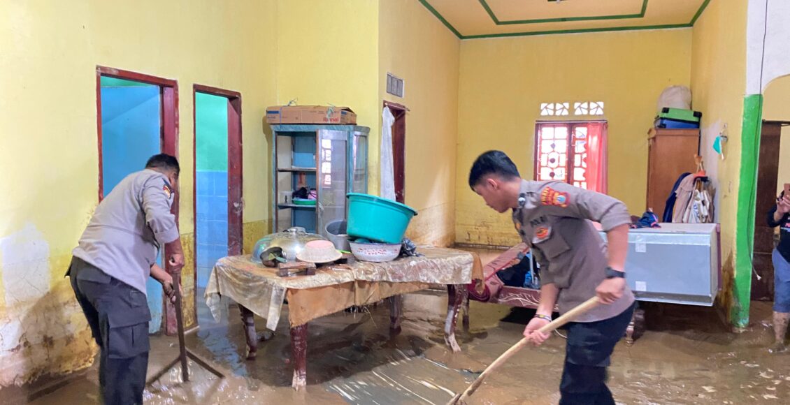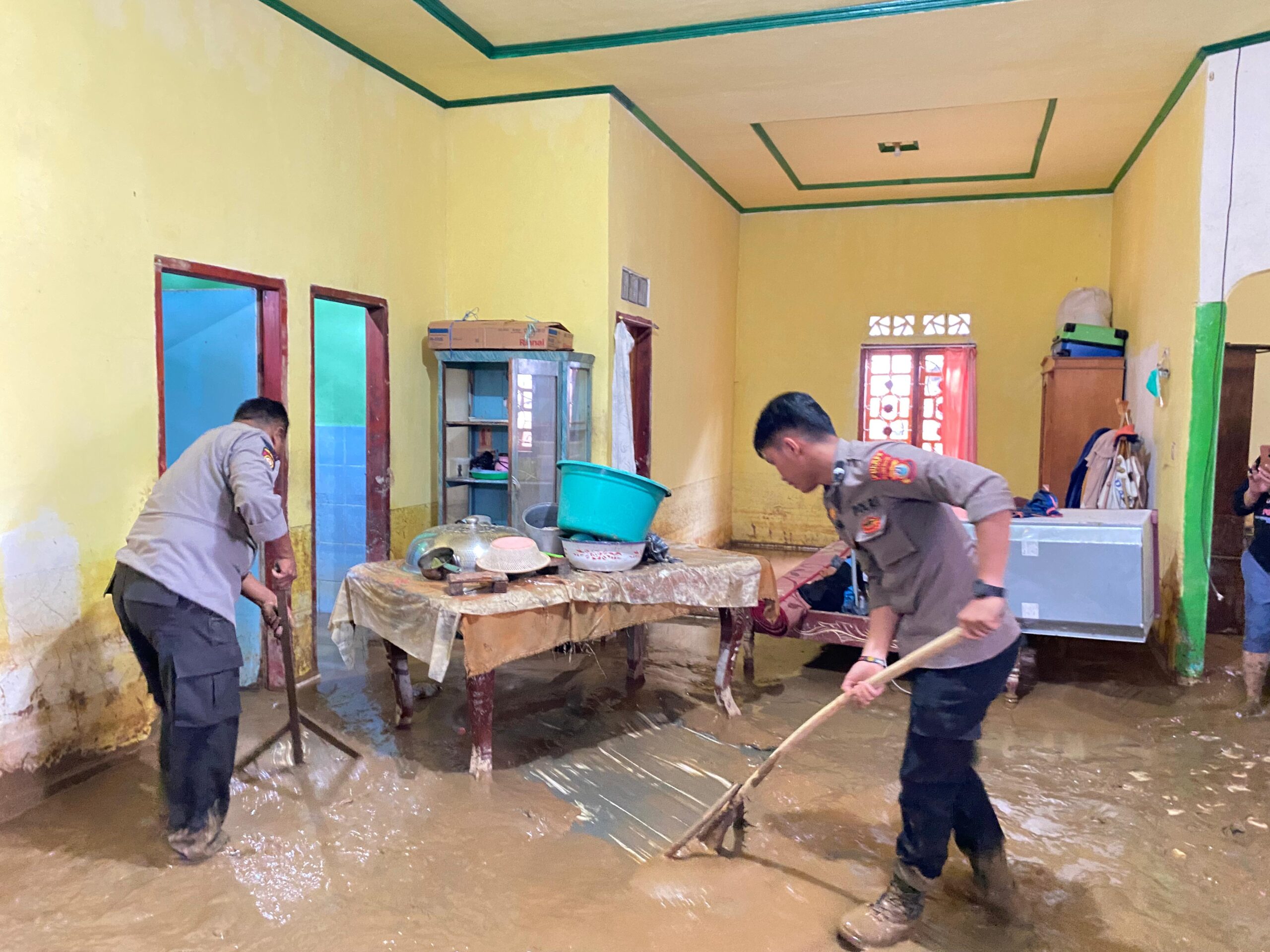 Polisi Bantu Bersihkan Rumah Warga Terdampak Banjir Di Luwu, Tak Ketinggalan, Bhayangkari juga Bagi Bantuan