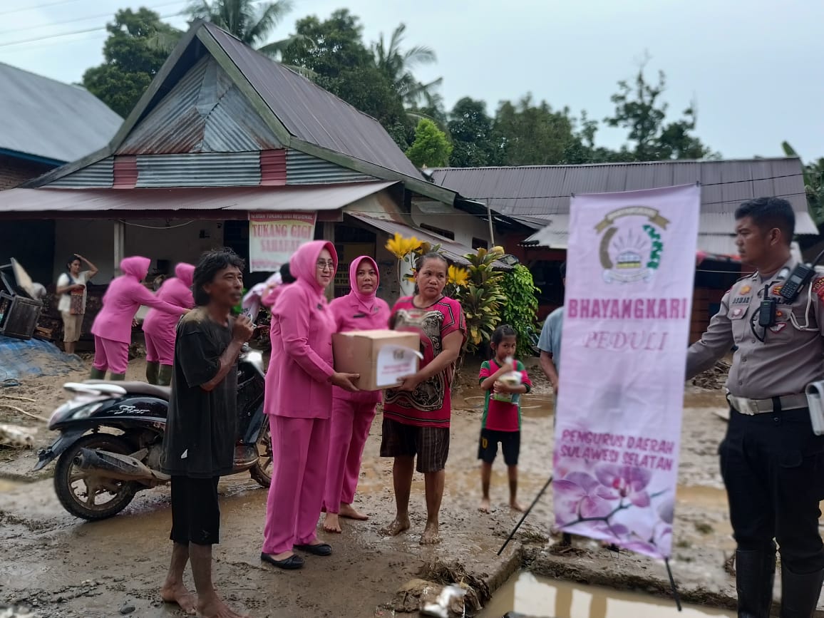 Sementara itu, Bhayangkari Daerah Polda Sulsel dan Bhayangjari cabang Polres Luwu juga ambil bagian dengan memberikan paket bantuan kepada korban banjir di Kab Luwu.