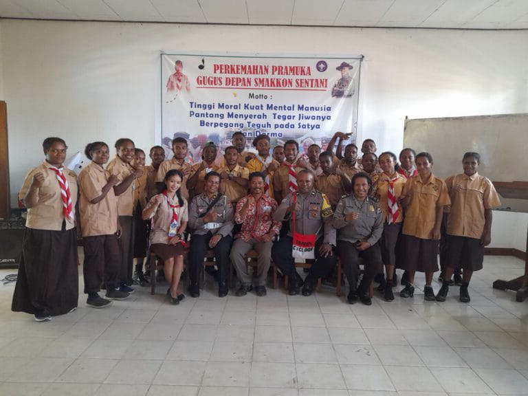 “Sosialisasi dilakukan disela-sela kegiatan Perkemahan Pramuka Gugus Depan Smakkon Sentani dengan moto Tinggi moral kuat mental manusia pantang menyerah tegar jiwanya berpegang teguh pada saya dan darma.