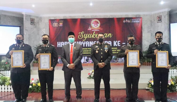 Cilegon – Kapolres Cilegon AKBP Sigit Haryono Si.k. S.H. dalam hal ini di wakilkan oleh Kasi Humas Polres Cilegon IPTU Sigit Dermawan S.H. Saat di temui awak media membenarkan bahwa pada hari ini di Hari Bhyangkara ke 75 Kapolres Cilegon memberikan penghargaan kepada personil yang telah berprestasi dalam melaksanakan tugasnya, pemberian penghargaan tersebut berlangsung di aula serba guna Polres Cilegon dengan mengedepankan Protokol kesehatan.