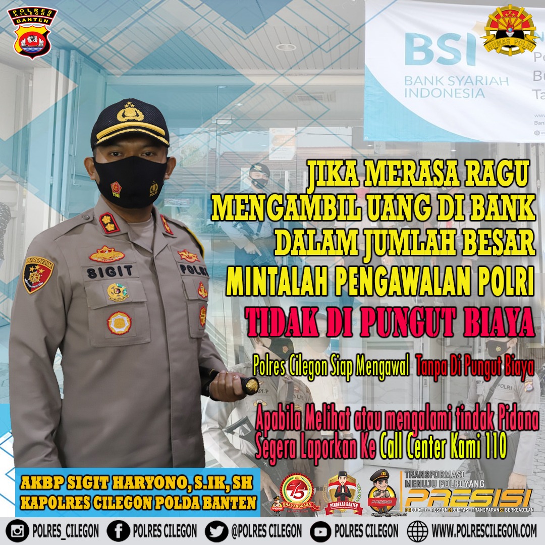 Kapolres Cilegon Polda Banten AKBP Sigit Haryono SIK SH diwakili Kasat Samapta Polres Cilegon IPTU Choirul Anam, SH, MH, M.si mengatakan bahwa kami menyediakan layanan pengawalan Uang dalam jumlah besar di perbankan diwilayah Kota Cilegon dapat menghubungi Call Center Polres Cilegon Polda Banten 110.