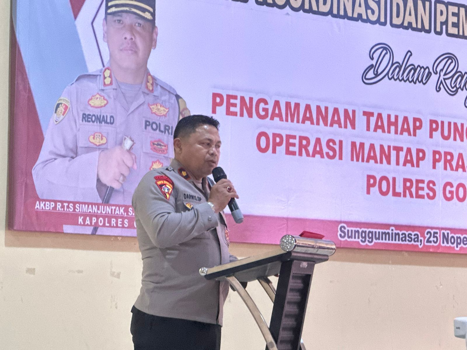 Dalam sambutannya, KOMPOL Darwis Daud, S.H. menegaskan pentingnya sinergi antara Polri, TNI, dan elemen pendukung lainnya untuk menciptakan situasi yang aman, damai, dan kondusif selama proses pemungutan suara.