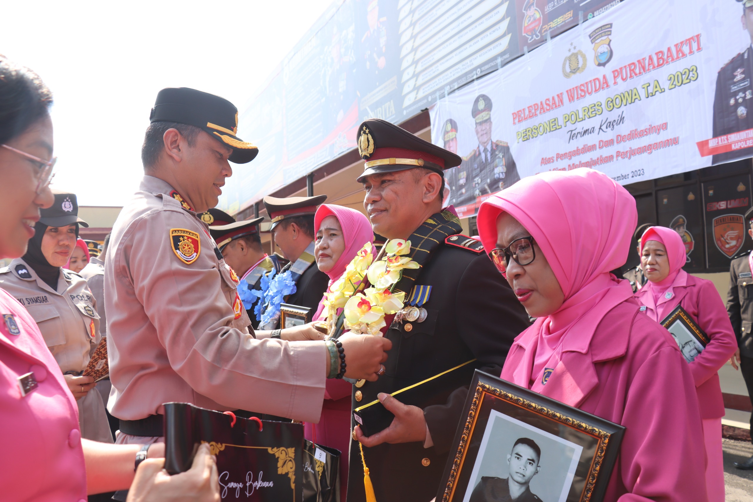 Pada kesempatan tersebut, 33 personel dan ASN Polres Gowa yang menyelesaikan masa baktinya, menerima tanda penghargaan, cindera mata, dan pengalungan bunga secara simbolis dari Kapolres.