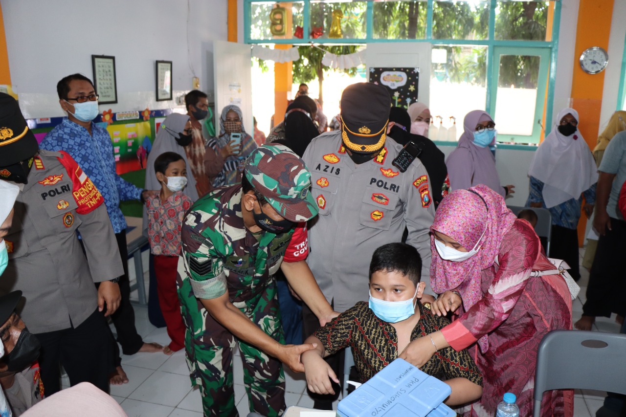 Vaksinasi Merdeka ini untuk anak usia 6-11 tahun. Kapolres Gresik AKBP Mochamad Nur Azis meninjau vaksinasi di SD YIMI 275 murid, di SD Muhammadiyah sekitar 200 murid dan SD Al Ibrah sekitar 300 murid.