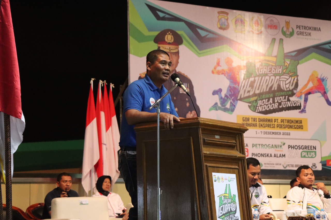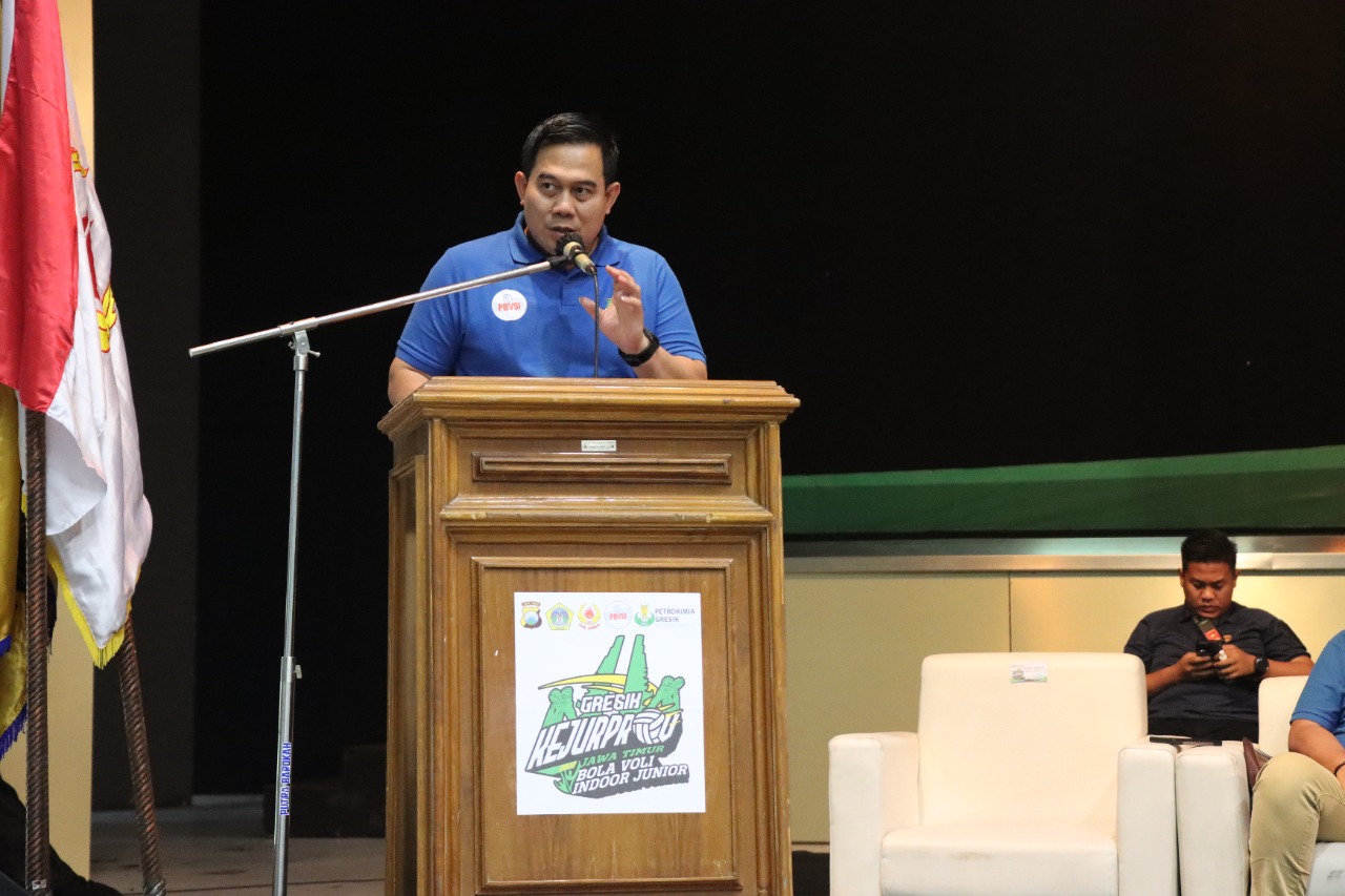 Ketum Umum Pengurus Kabupaten PBVSI Kab. Gresik yang juga Kapolres Gresik AKBP Mochamad Nur Azis, SH, SIK, M.Si menyampaikan tujuan pelaksanaan kejurprov Jatim untuk mempererat tali persaudaraan.
