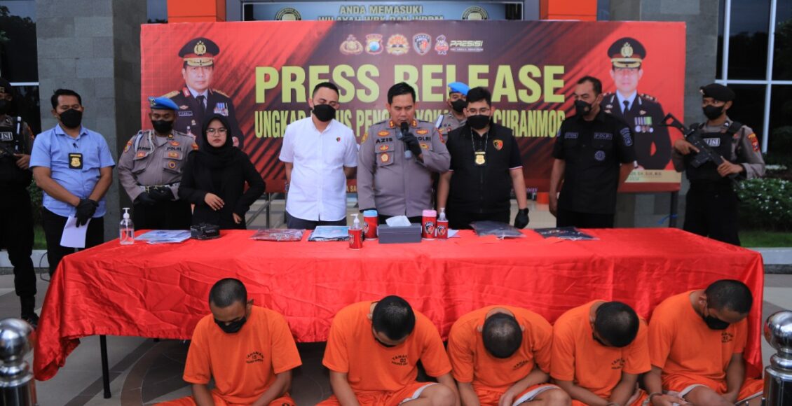 Kapolres Gresik didampingi Kasat Reskrim Polres Gresik Iptu Aldino Prima Wirdan melakukan press release di halaman Mapolres Gresik. Rabu (30-11-2022). Lima orang tersangka dipamerkan di depan awak media.