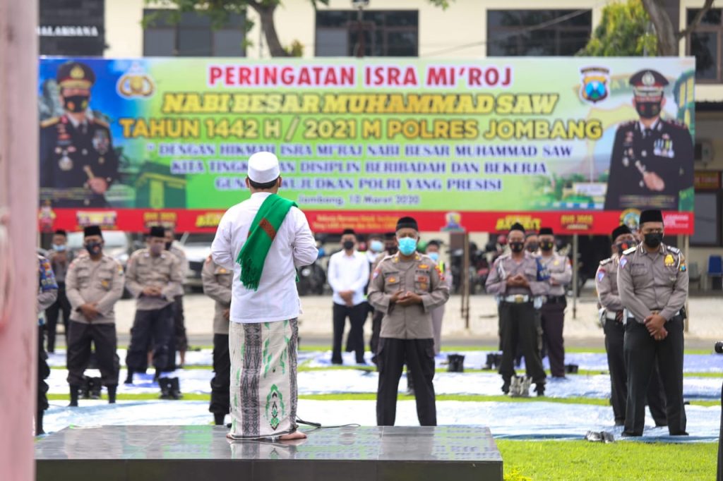 JOMBANG,IKAGAWANEWS.ID – Kapala Kepolisian Resort (Kapolres) Kapolres Jombang AKBP AGUNG SETYO NUGROHO ,S.I.K.malasanakan kegiatan Peringatan Isra’ Mi’raj Nabi Muhammad SAW 1442/Tahun 2021Rabu tanggal 10 Maret 2021 pukul 07.00 wib di Lapangan Polres.