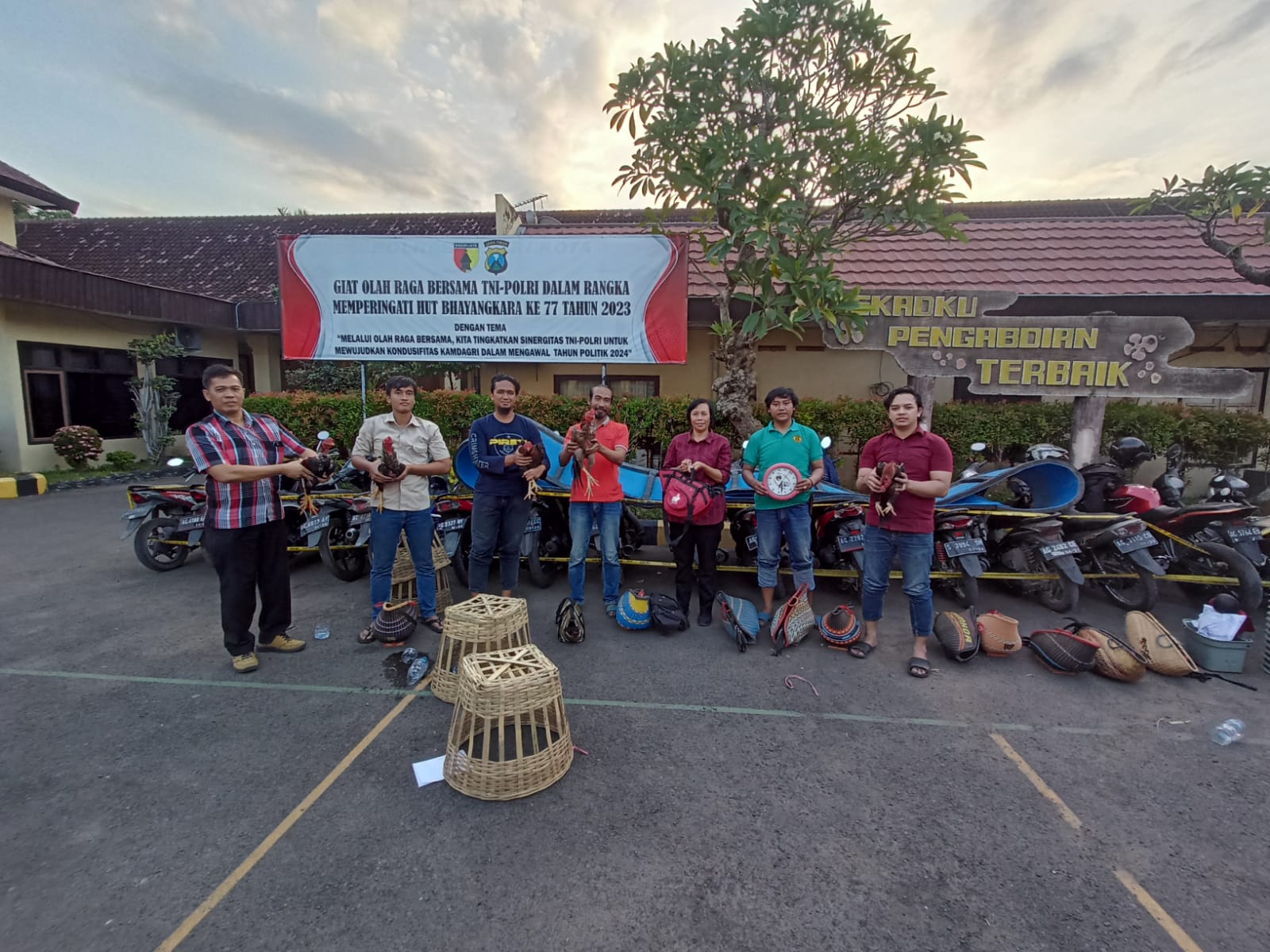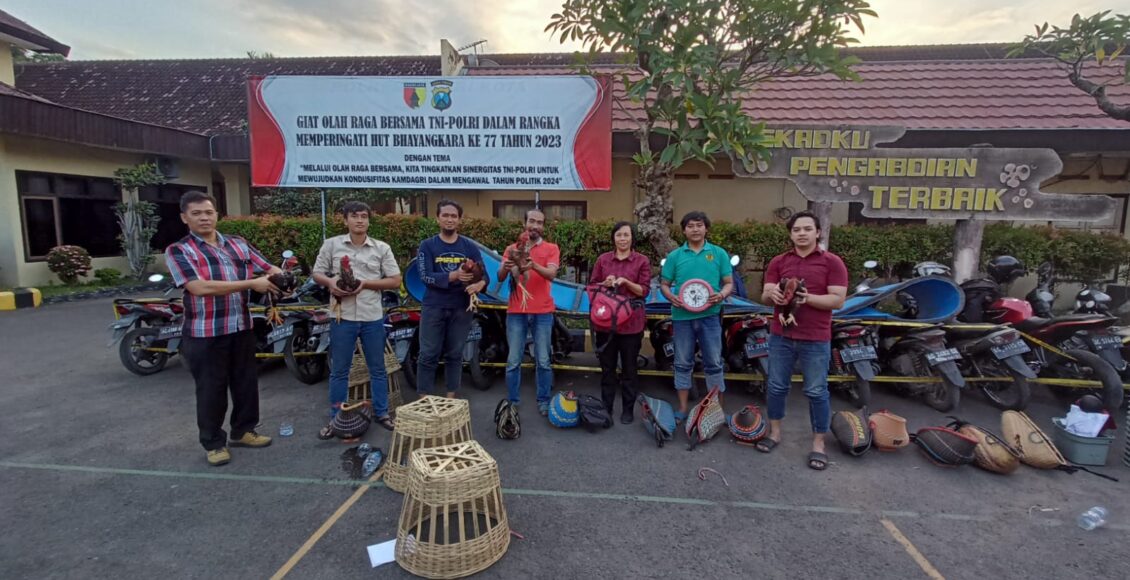 Polisi berhasil menyita barang bukti yang ditinggal para penyabung, diantaranya 15 ekor ayam aduan, 1 ring kalangan ayam terbuat dari kain ukuran 6×4 meter, 1 ring kalangan ayam terbuat dari spon berwarna biru , 5 buah kurungan ayam kecil, 9 buah kurungan ayam besar, 2 buah jam dinding, 19 buah kursi plastik, 16 unit sepeda motor.