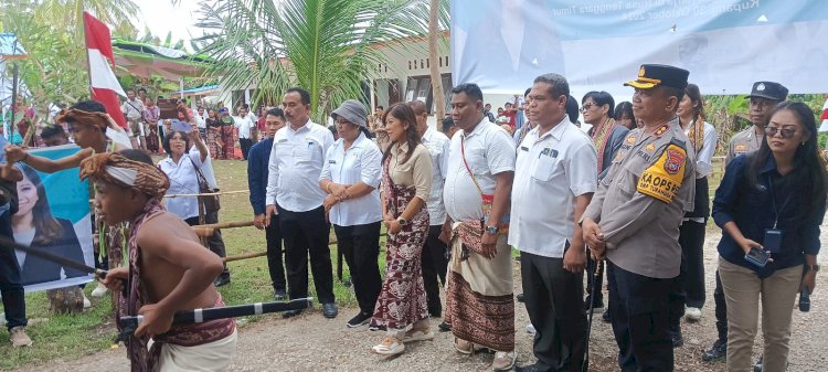 Menkomdigi Hj. Meutya Viada Hafid, B.Eg., M.I.P didampingi Dirut Bakti Mathar Fadhilah, Dirjen Aptika Hokky Situngkir serta rombongan kemenkomdigi yang diterima secara adat Natoni oleh para siswa dan guru SMPN 6 Amarasi Selatan dan pengalungan selendang oleh PLT Sekda Nofita Funai didampingi Asisten I Kabupaten Kupang dan Kadis Pendidikan dan Kebudayaan Eliaser Teuf serta Kapolres Kupang AKBP Anak Agung Gde Anom Wirata, S.I.K., M.H.