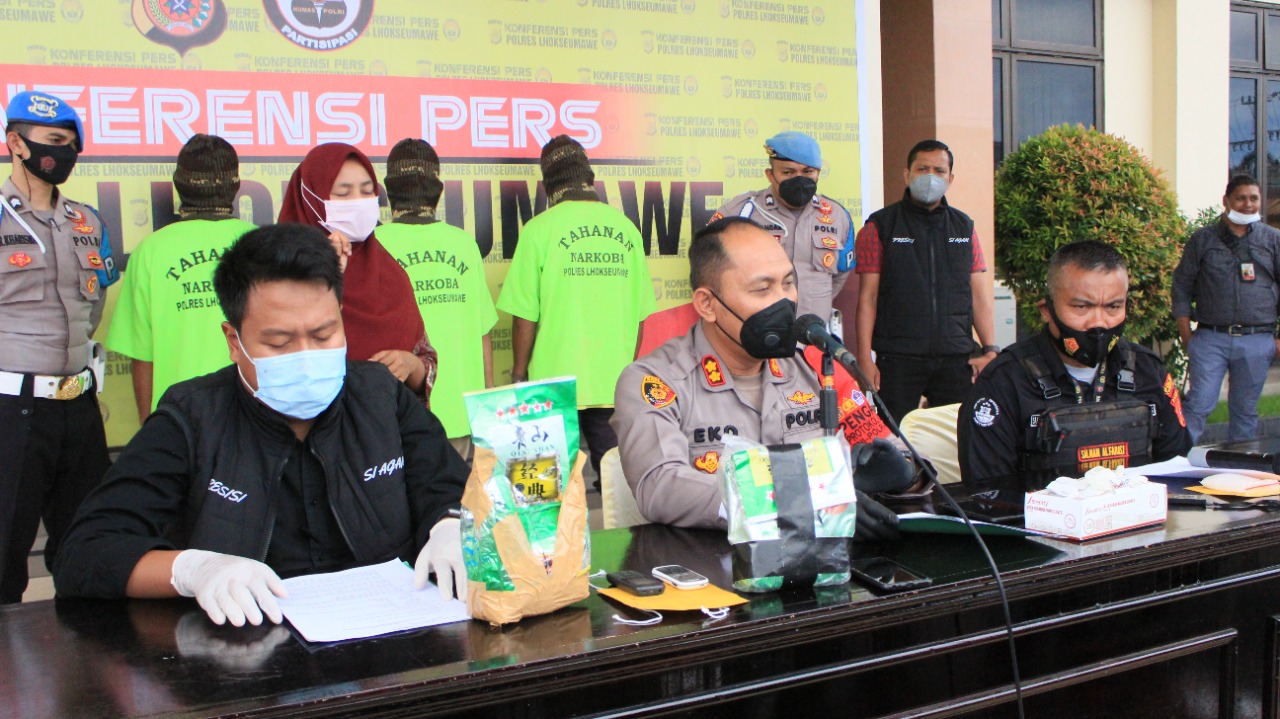 Kapolres Lhokseumawe AKBP Eko Hartanto SIK MH dalam konferensi pers yang berlangsung di Mapolres Lhokseumawe, Kamis (28/10/2021) mengatakan, tersangka yang diamankan petugas yaitu berinisial MM (30) pemilik rumah, warga Kecamatan Muara Batu. Selain itu, barang bukti yang disita 87,18 gram sabu – sabu.