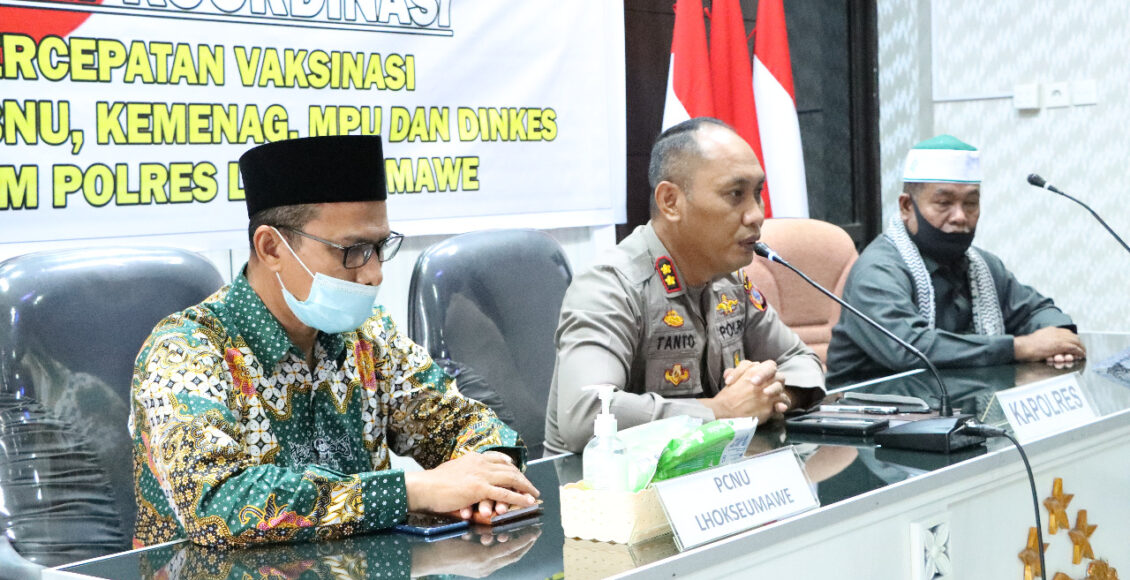 Lanjut Salman, rapat kordinasi Kapolres Lhokseumawe bersama PCNU, Kemenag, MPU dan Dinkes ini bertujuan untuk membahas kolaborasi dan tindakan yang tepat agar vaksinasi di wilayah hukum Polres Lhokseumawe dapat segera memenuhi target.