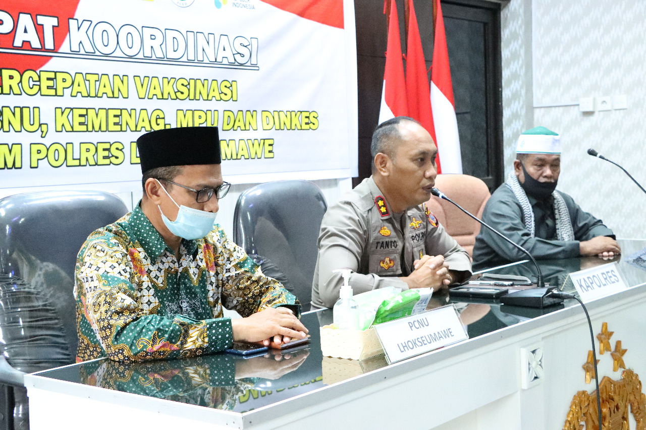 “Hasil rapat akan dilaksanakan Vaksinasi serentak berkolaborasi dengan PCNU, KEMENANG, MPU, dan DINKES yang akan dilaksanakan dari tgl 21 – 23 April 2022 di Polres Lhokseumawe”ungkapnya.