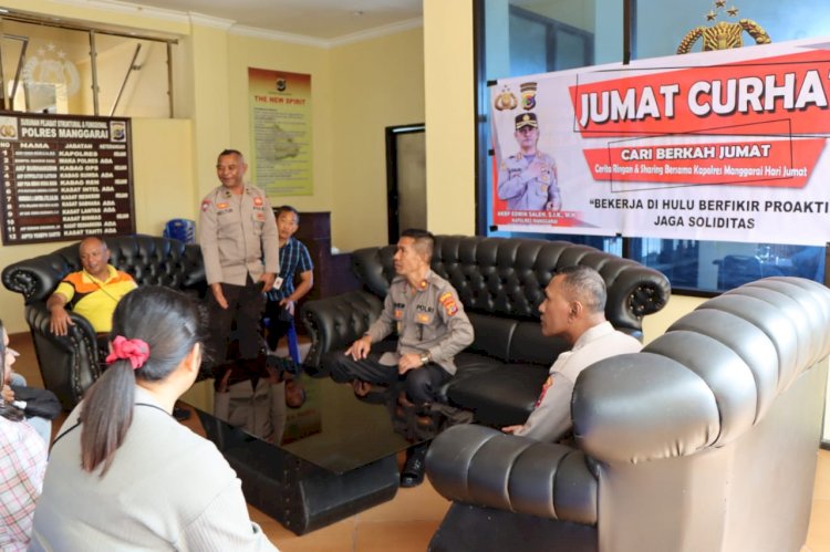 Pada kesempatan tersebut Waka Polres Manggarai KOMPOL SAHIDIN SUNA memberikan penyampaian bahwa program Jumat Curhat yang dilaksanakan ini sudah merupakan program wajib dengan tujuan agar dapat saling komunikasi dan bertukar informasi antara Tokoh Masyarakat, Tokoh Pemerintahan, Para Pelajar atau Mahasiswa serta masyarakat seperti sekarang ini, jika terjadi kendala terkait pelayanan kepolisian di masyarakat serta Gangguan Kamtibmas di Masyarakat dapat disampaikan.