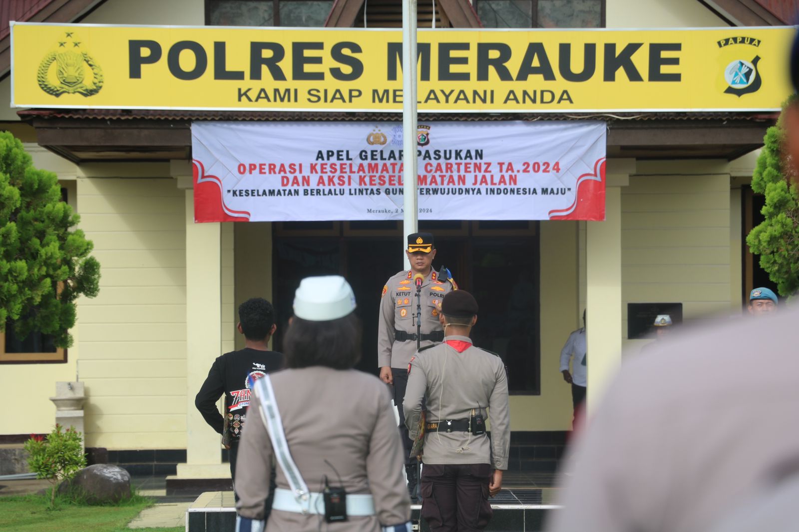 Pelaksanakan Apel kesiapan Ops Keselamatan Cartenz 2024 di warnai dengan pemeriksaan pasukan oleh Kapolres Merauke, penyematan Pita Operasi dan deklarasi ikrar tertib berlalu lintas,”.