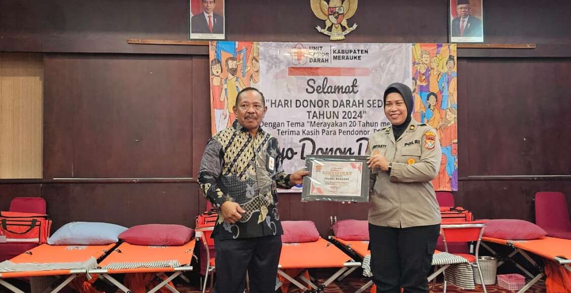 Penerimaan piagam penghargaan karena aktif melakukan kegiatan Donor darah dalam rangka Hari Donor Darah Sedunia (HDDS) tahun 2024, sebagai tanda ucapan terima kasih kepada pihak Polres Merauke.