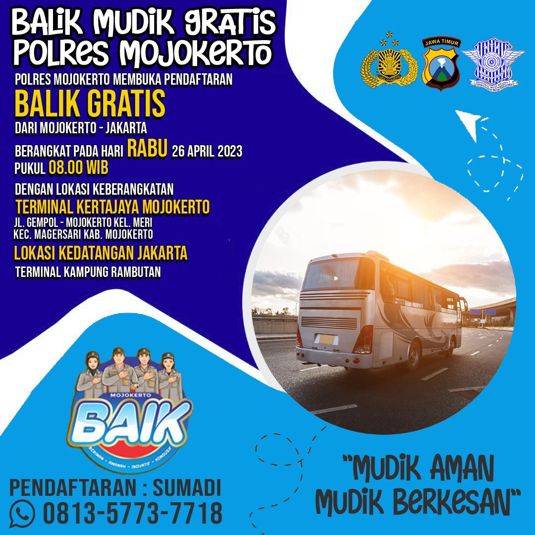 M0JOKERTO,ikagawanews.id – Polres Mojokerto memberikan layanan balik gratis bagi para pemudik yang akan kembali ke Jakarta setelah mudik Lebaran.