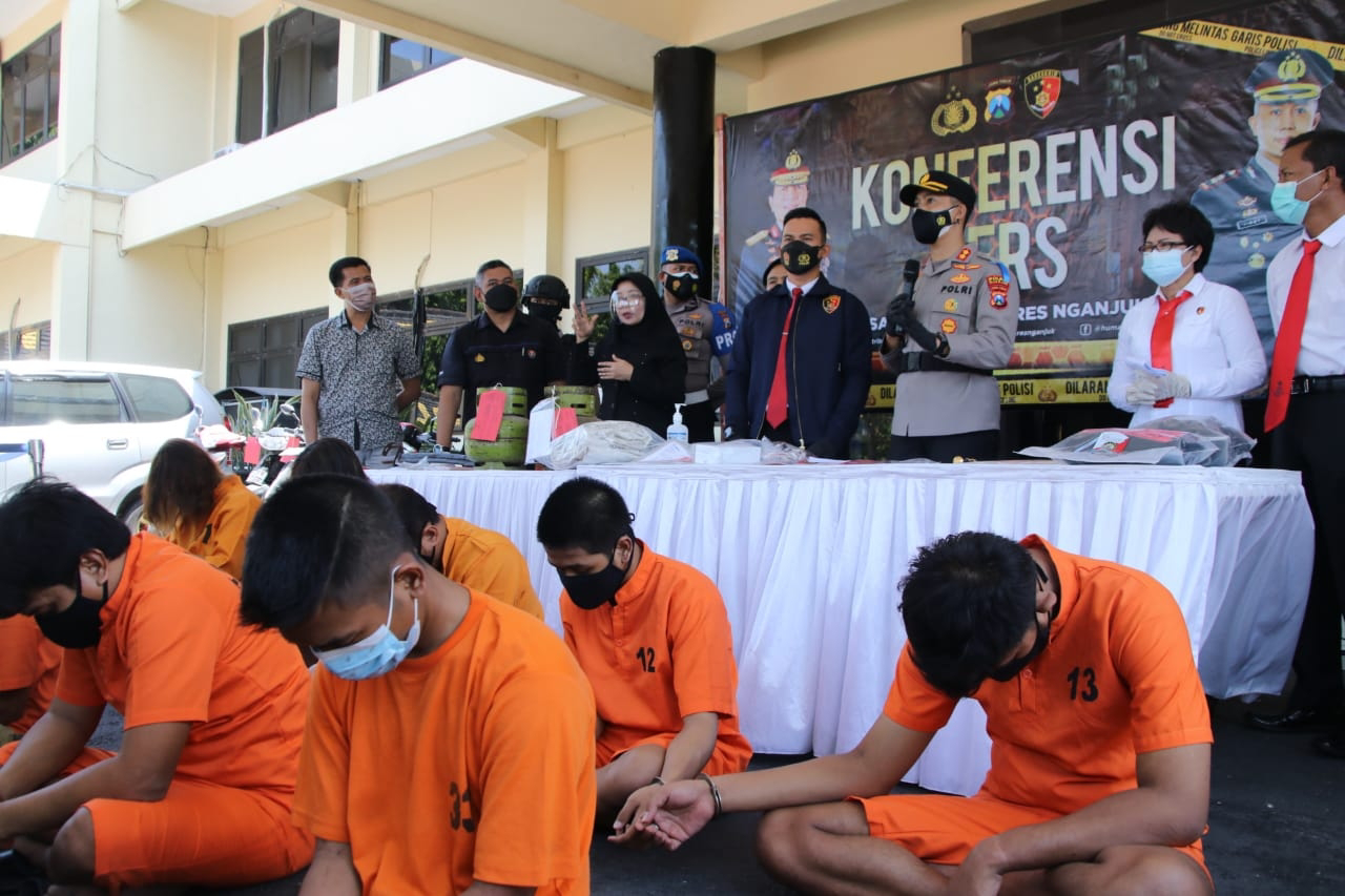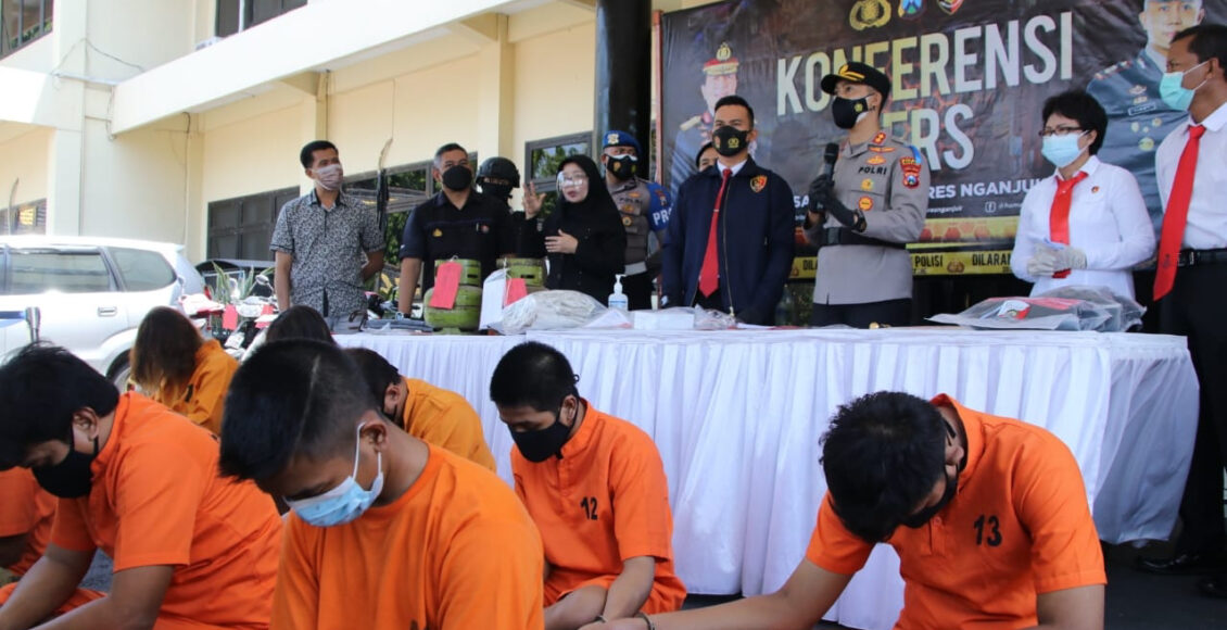 “Ada 9 kasus yang kita ungkap dengan 17 tersangka. Terdiri dari 5 tersangka bawah umur dan 12 tersangka dewasa. Dua di antaranya perempuan,” ujar Kapolres Nganjuk AKBP Jimmy Tana, S.I.K. saat konferensi pers, Senin (20/9/2021).