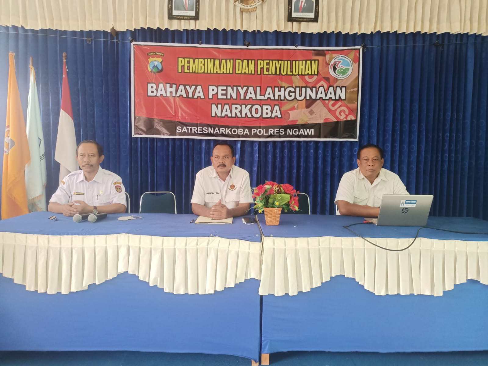 Kegiatan sosialisasi penyuluhan, pembinaan dan pencegahan penyalahgunaan serta peredaran narkoba tersebut dipimpin oleh KBO (Kepala Pembinaan Operasional) Satresnarkoba Polres Ngawi Iptu Arifin TM.