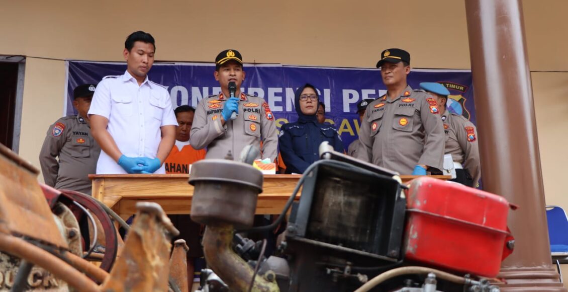 “Polres Ngawi melalui Polsek Geneng berhasil mengamankan 3 (tiga) orang pelaku bersama barang bukti, yakni 2 (dua) mesin pembajak sawah dan 1 (satu) mobil jenis pick up jenis Colt T warna abu-abu No. Pol AE 8120 NE,” jelas Wakapolres Ngawi, Kompol Haryanto, S.H., S.I.K., M.H saat konferensi pers di Polsek Geneng,kemarin Rabu (1/2/23).