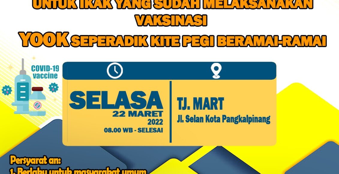 Pangkalpinang,ikagawanews.id – Kepolisian Resor Pangkalpinang bekerjasama dengan pusat perbelanjaan TJ Mart yang beralamat di Jalan Selan Pangkalpinang, kembali menggelar giat vaksinasi dosis 1, 2 dan 3 (booster) besok 22 Maret 2022.