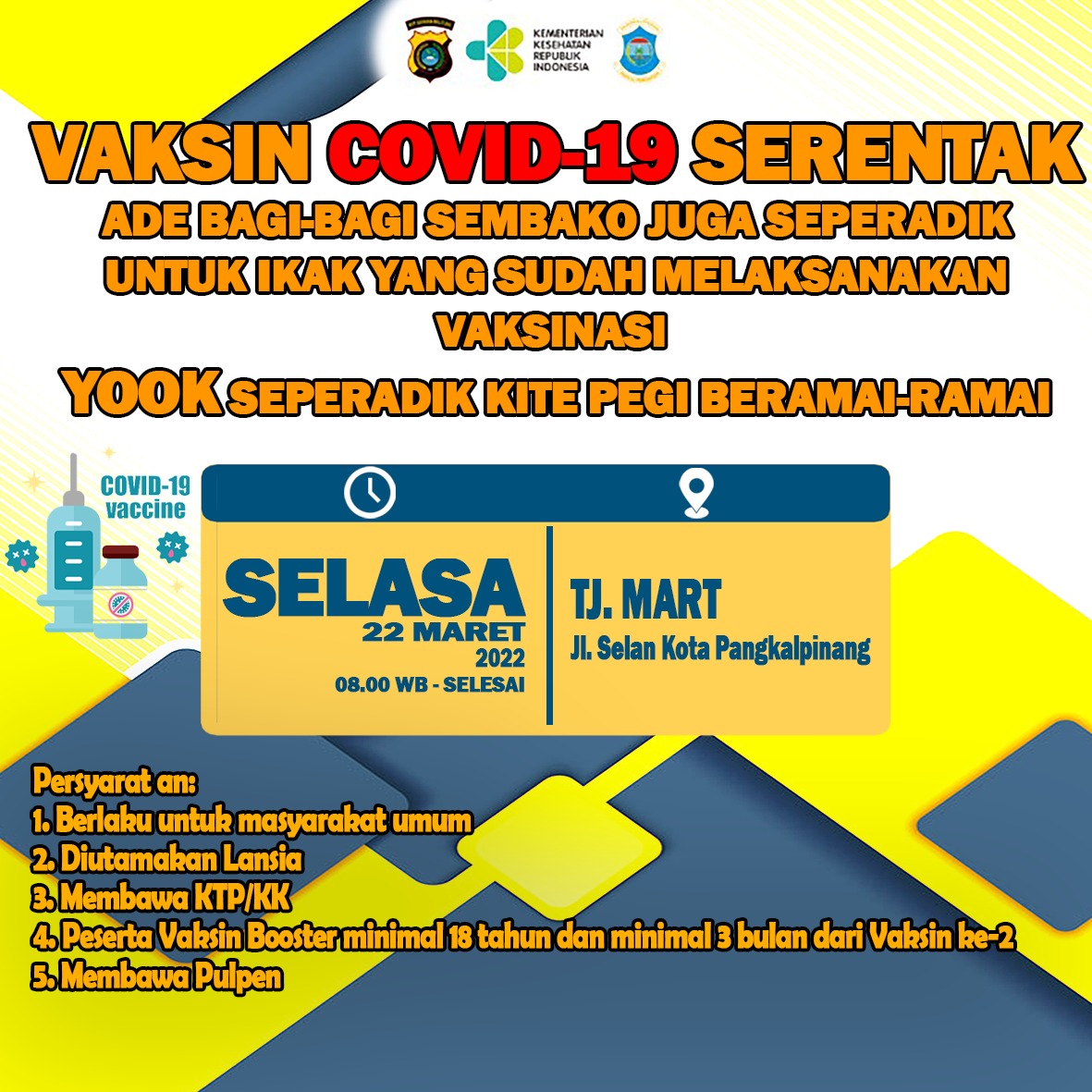 “Kepada masyarakat Kota Pangkalpinang, kegiatan vaksinasi dosis 1, 2 dan 3 yang akan dilaksanakan besok selasa 22 Maret 2002 dimulai dari pukul 08.00 Wib sampai selesai di TJ Mart Jalan Selan, ungkap Kapolres Pangkalpinang. Senin (21/3).