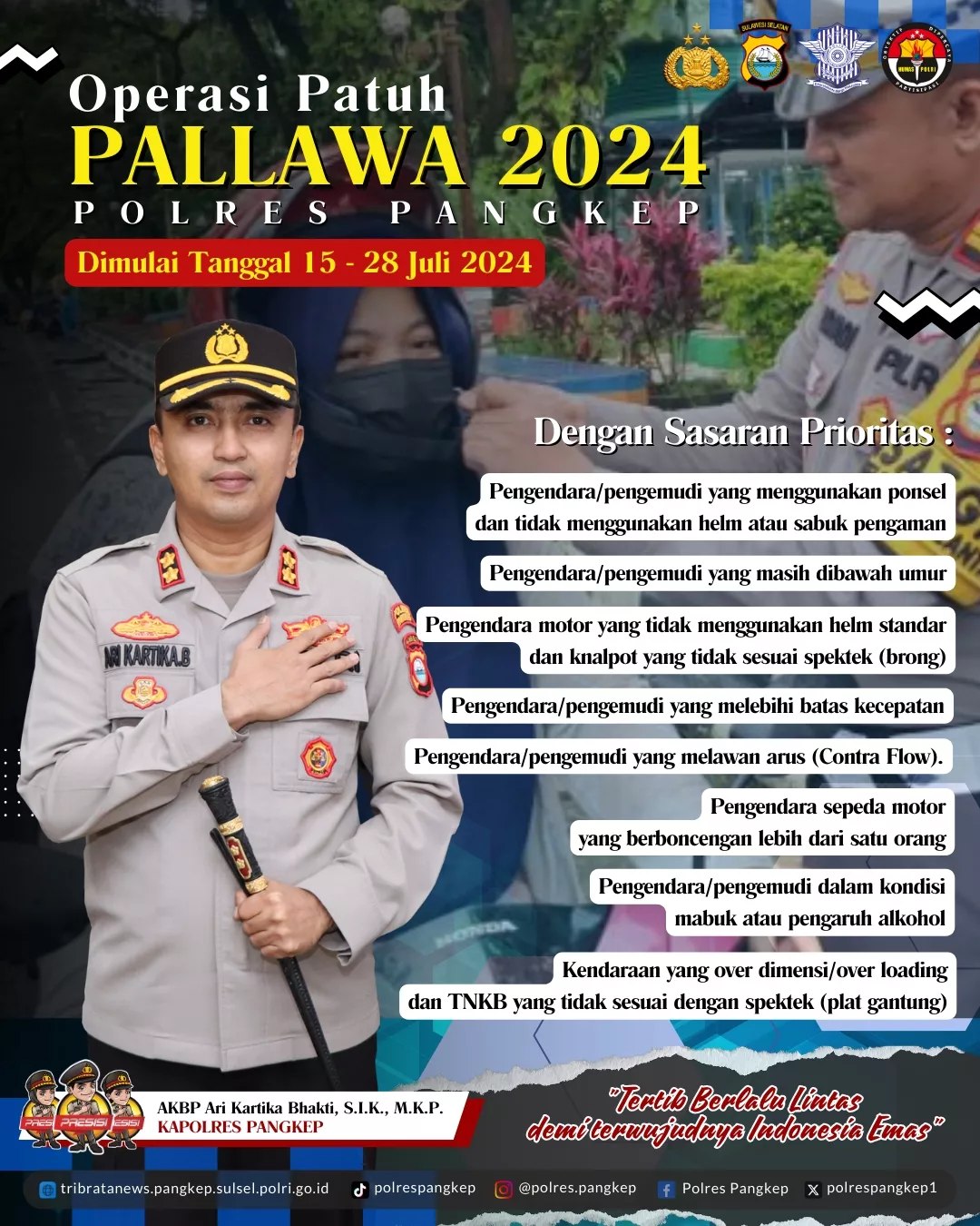 Operasi Patuh pallawa-2024 yang akan dilaksanakan selama 14 hari, yang dimulai dari 15 S/d 28 Juli 2024 secara serentak diseluruh indonesia dengan mengedepankan giat preemtif, preventif dan didukung pola gakkum lantas secara elektronik serta teguran simpatik dan humanis.