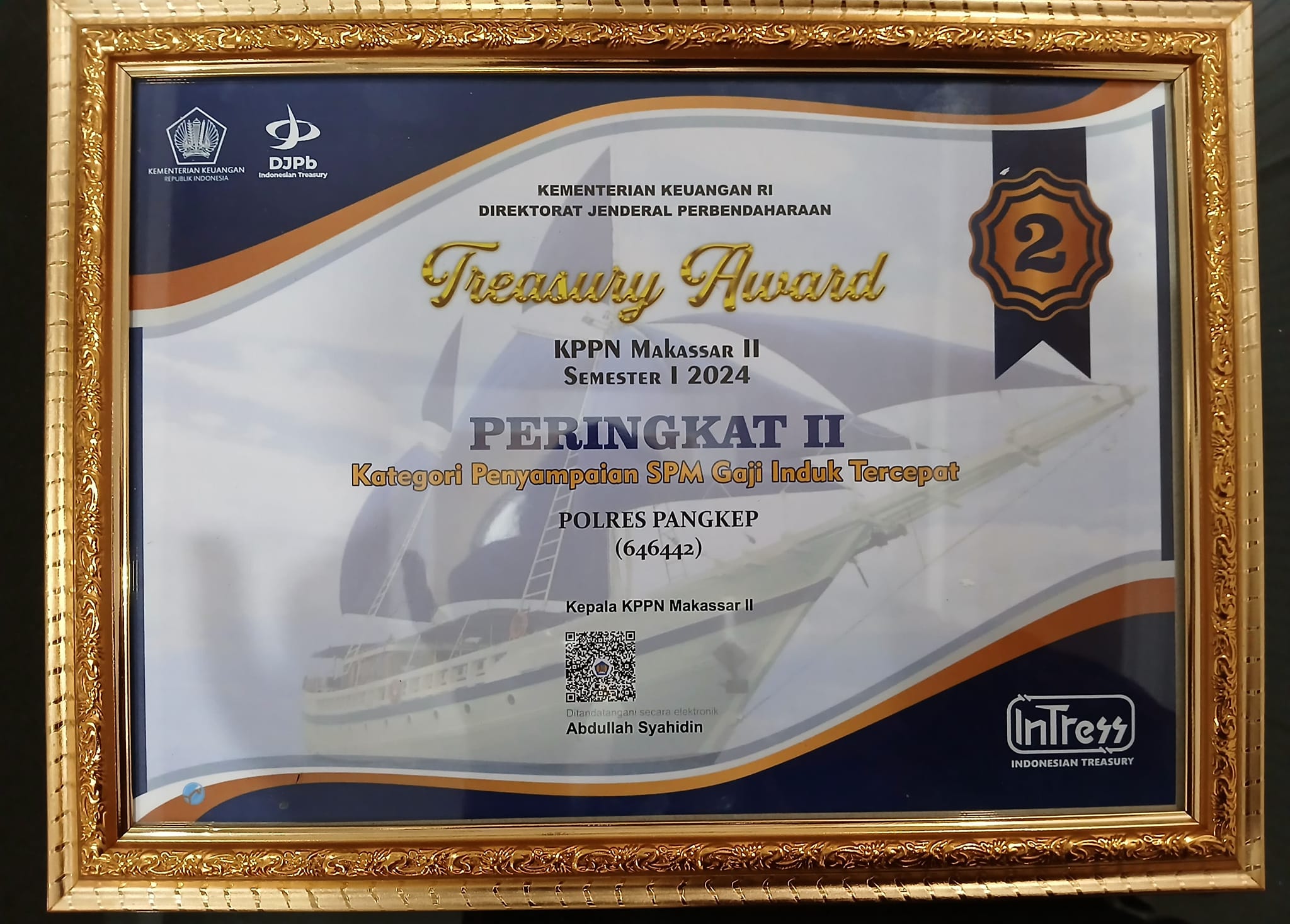 MAKASSAR,ikagawanews.id – Polres Pangkep menerima penghargaan pada kegiatan Treasury Award yang diselenggarakan oleh KPPN Makassar II untuk semester pertama tahun 2024. Dalam acara tersebut, Polres Pangkep meraih peringkat II sebagai satuan kerja terbaik dalam hal akurasi dan SPM terbaik,25 September 2024, di Ruang Layanan FO KPPN Makassar II.