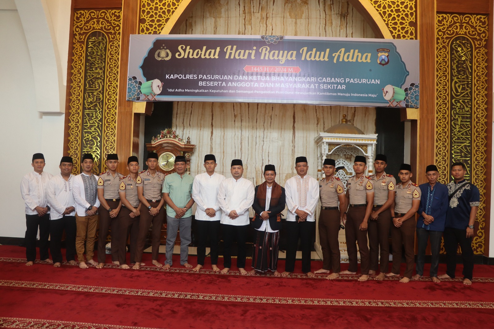 Kegiatan diawali dengan mengumandangkan takbir, takhmid, tasbih, dan tahlil, kemudian dilanjutkan melaksanakan Sholat Ied berjama’ah dengan seluruh anggota Polres Pasuruan beserta keluarga, dan yang menjadi Khotib sekaligus sebagai imam Shalat Ied adalah Doktor Muhammad Yusuf Wijaya, LC, MMA.