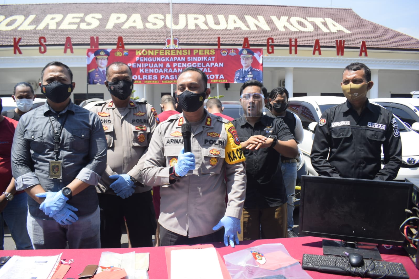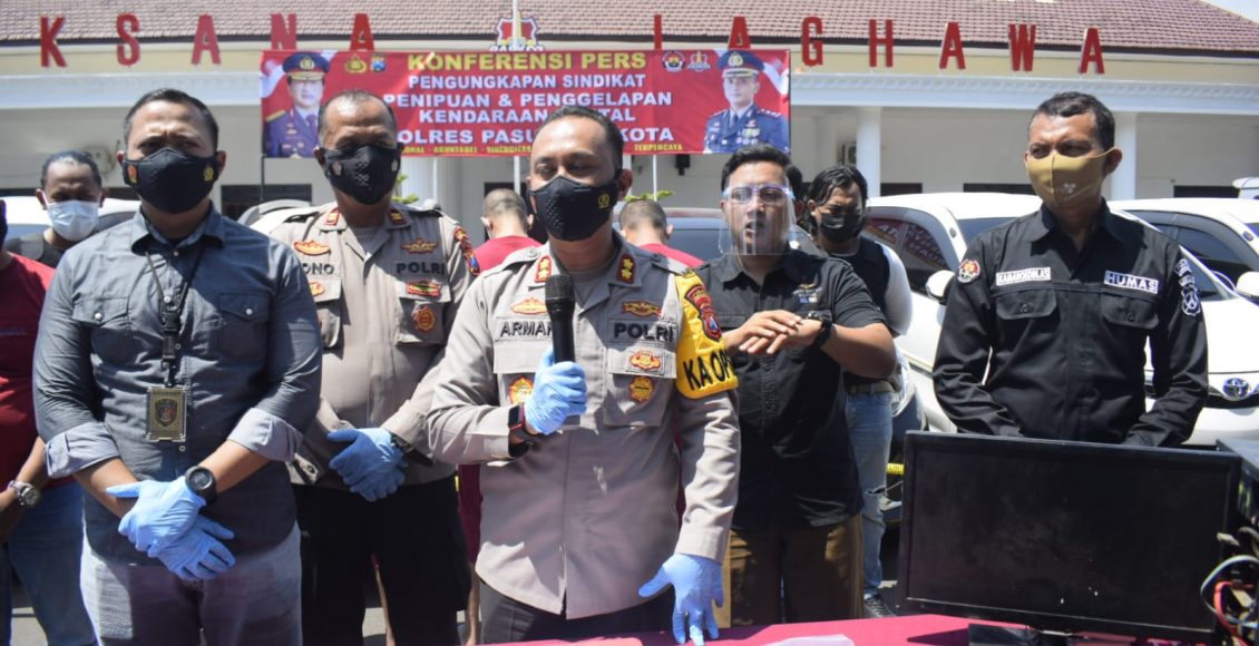 Pasuruan Kota,ikagawanews.id – Satuan Reserse Kriminal (Sat Reskrim) Polres Pasuruan Kota, melaksanakan Konferensi Pers hasil pengungkapan Sindikat Penipuan dan Atau Penggelapan Kendaraan Rental, Selasa (26/10) siang.