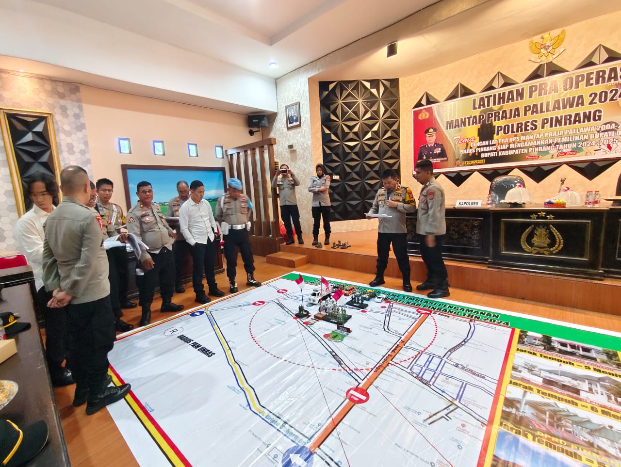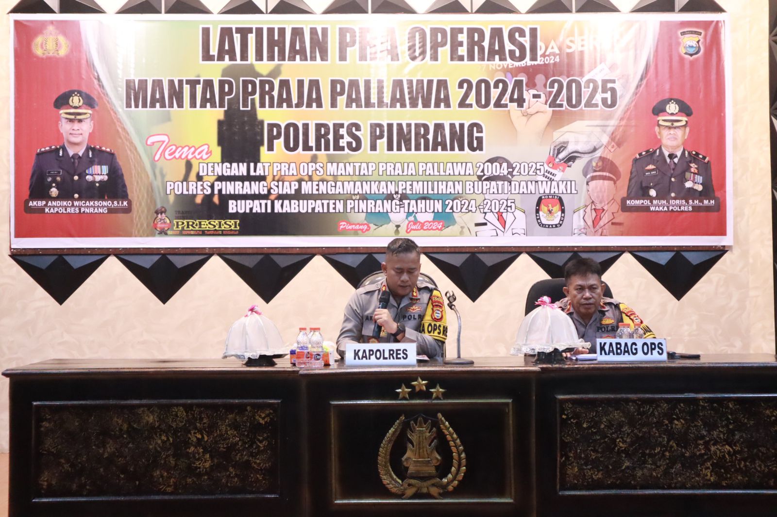 Latihan Pra Operasi ini dipimpin Kapolres Pinrang AKBP Andiko Wicaksono, S.I.K didampingi Kabag Ops Polres Pinrang KOMPOL Muh.Yusuf Badu, S.H bertempat di Aula Wicaksana Laghawa Polres Pinrang.
