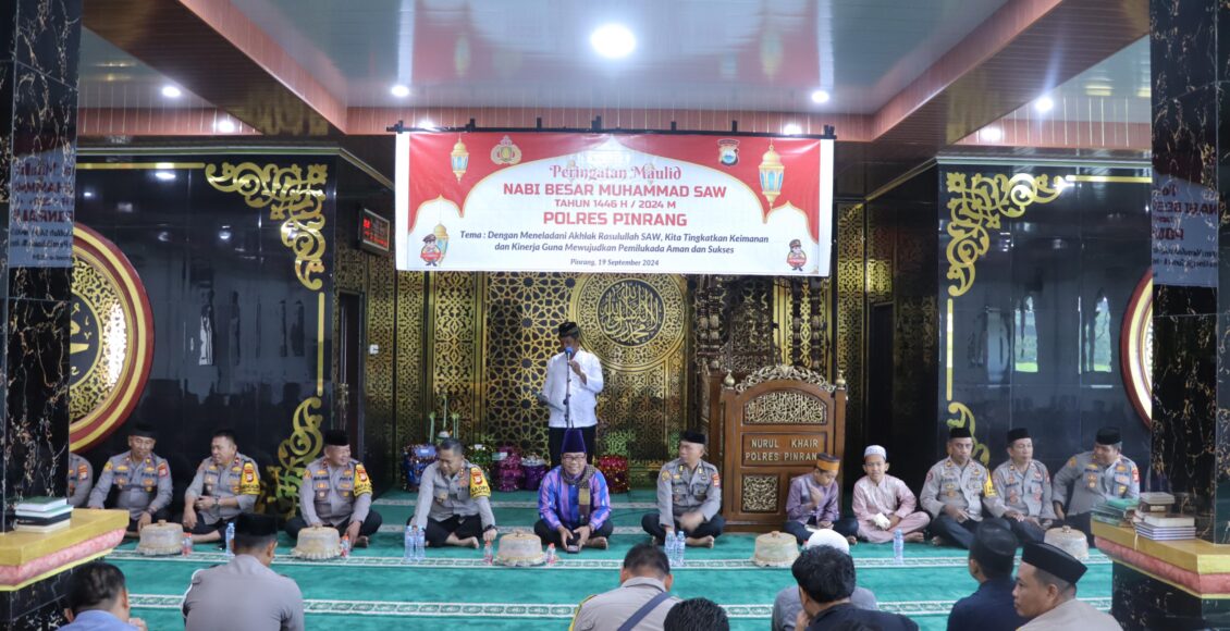 Kegiatan Peringatan Maulid Nabi Muhammad SAW 1446 H di Masjid Nurul Khair Polres Pinrang ini dengan tema “Dengan Meneladani Akhlak Rasulullah SAW Kita Tingkatkan Keimanan dan Kinerja Guna Mewujudkan Pemilukada Aman dan Sukses”.