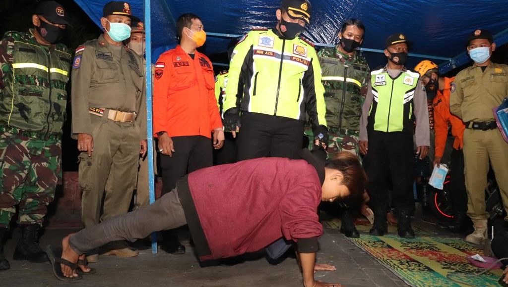 Patroli pun menyasar tempat tempat kerumunan massa yang di mungkinkan tidak mematuhi Protokol Kesehatan. Dari tempat angkringan medapatkan hasil masyarakat yang tidak memakai masker sebanyak 1 orang, dan 17 orang tidak memakai masker dengan benar sehingga di berikan sanksi sosial oleh petugas berupa Push Up serta teguran lisan.