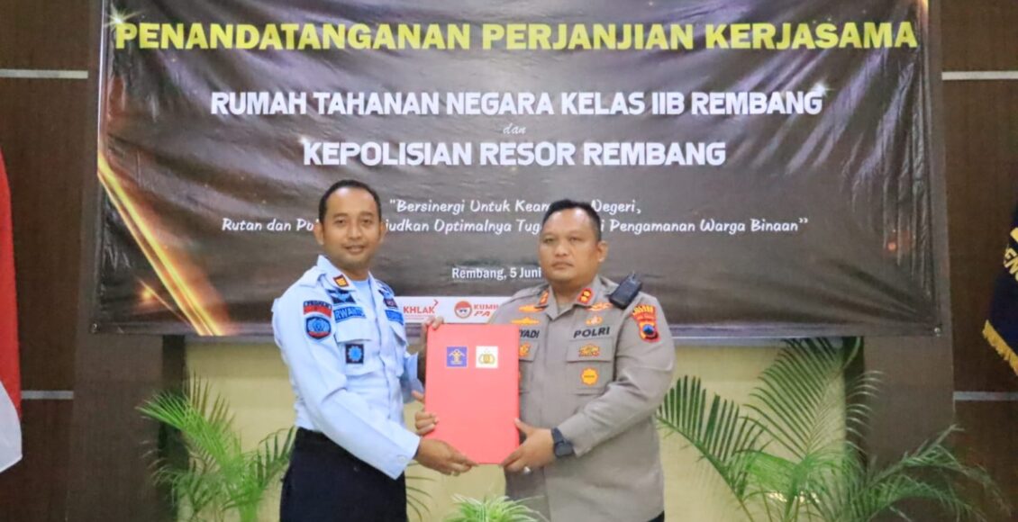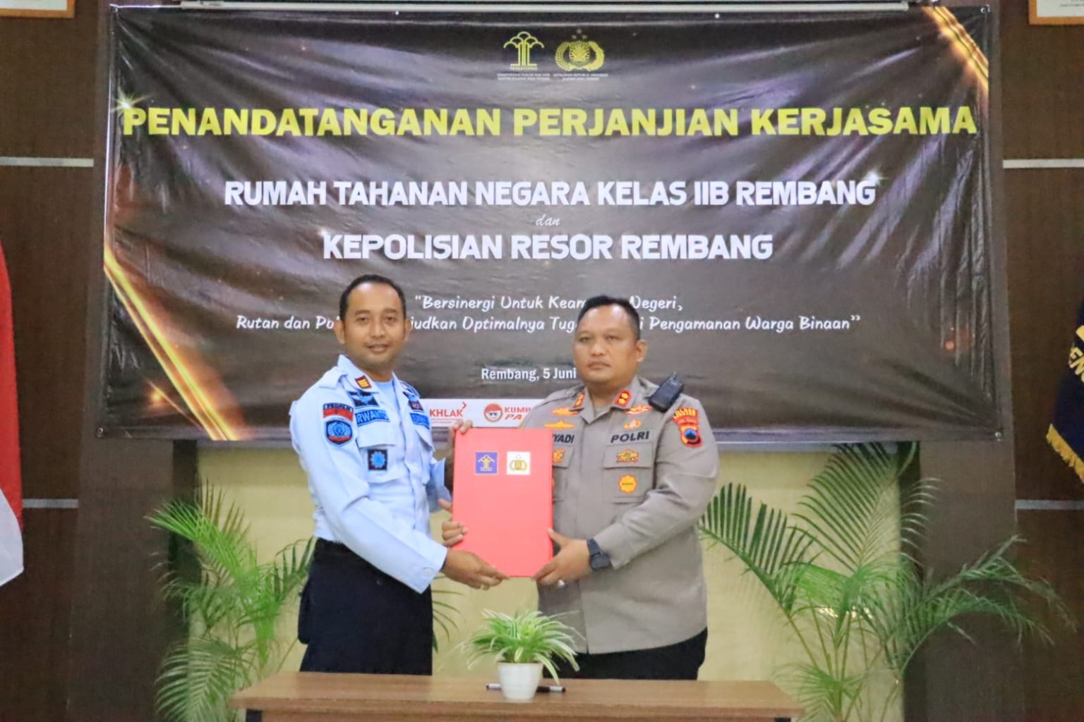 REMBANG ,ikagawanews.id – Untuk mewujudkan optimalnya tugas fungsi pengamanan warga binaan, Rumah Tahanan Negara (Rutan) Kelas IIB Rembang menjalin MoU dengan Polres Rembang. Penandatanganan yang juga dihadiri Kepala Kejaksaan Negeri Rembang itu dilaksanakan di aula Rutan Kelas IIB Rembang, Senin (5/6).